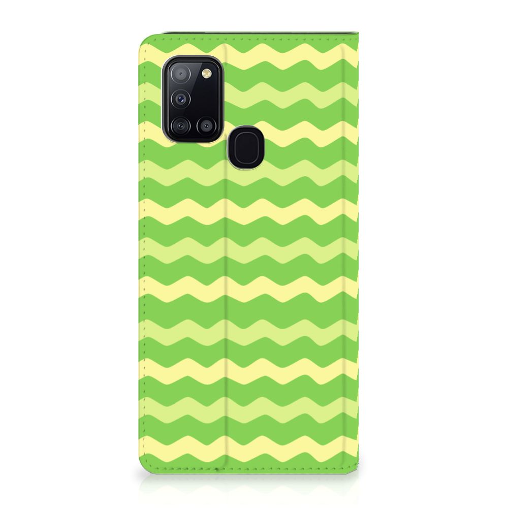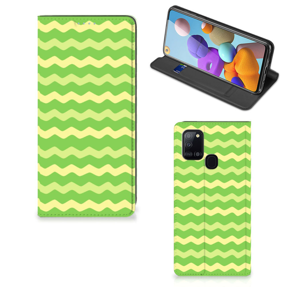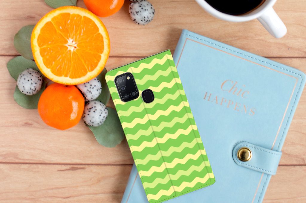 Dit groene design hoesje met groene golven is speciaal ontworpen voor jouw telefoon. We hebben een vleugje geel toegevoegd, zodat er sprake is van variatie. Dit Waves Green hoesje ziet er flitsend uit. Dat kan ook niet anders, als je weet dat we veel energie steken in het bedenken van originele designs. Een heel strak Samsung Galaxy A21s Hoesje met Magneet, met zeer veel opties. Past dit groene design hoesje met golven goed bij jou? Bestel het dan vandaag nog, tegen zeer lage kosten. Het design staat op een stand case. Deze case met groene golven beschermt jouw telefoon aan alle kanten en beschikt over een 1 opbergvakje en een speciale standaard. Het hoesje wordt afgesloten met een magneet aan de binnenzijde. De houder aan de binnenzijde is van TPU. Alle zijden van de stand case worden bedrukt.