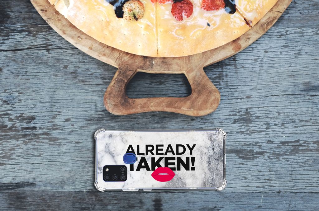 Ben je op zoek naar een uniek telefoonhoesje voor je Samsung Galaxy A21s? Dan ben je bij B2C Telecom aan het juiste adres! Speciaal voor jou hebben we dit prachtige Already Taken White design in onze collectie hoesjes opgenomen. Het design wordt bedrukt op een Telefoonhoesje met tekst en is gemaakt van flexibel rubber. Het hoesje is perfect voor de actieve smartphonegebruiker door de opstaande randen/hoeken. Denk aan mensen die veel sporten, reizen of wandelen en net iets meer zekerheid willen als het op hun geliefde telefoon aankomt. Het design wordt alleen aan de bovenkant van het hoesje bedrukt en de randen blijven transparant. Aan de zijkanten zijn uitsparingen gemaakt waardoor je met gemak alle knoppen en poorten kunt bedienen. Wij adviseren om dit hoesje in combinatie met een screenprotector te gebruiken voor een langere levensduur van je telefoon. Wil je dit hoesje nog iets extra's geven? Voeg dan gratis je naam of een quote toe! Is dit design hoesje toch niet helemaal wat je zocht? Ontwerp dan zelf een hoesje in ons ontwerpprogramma.