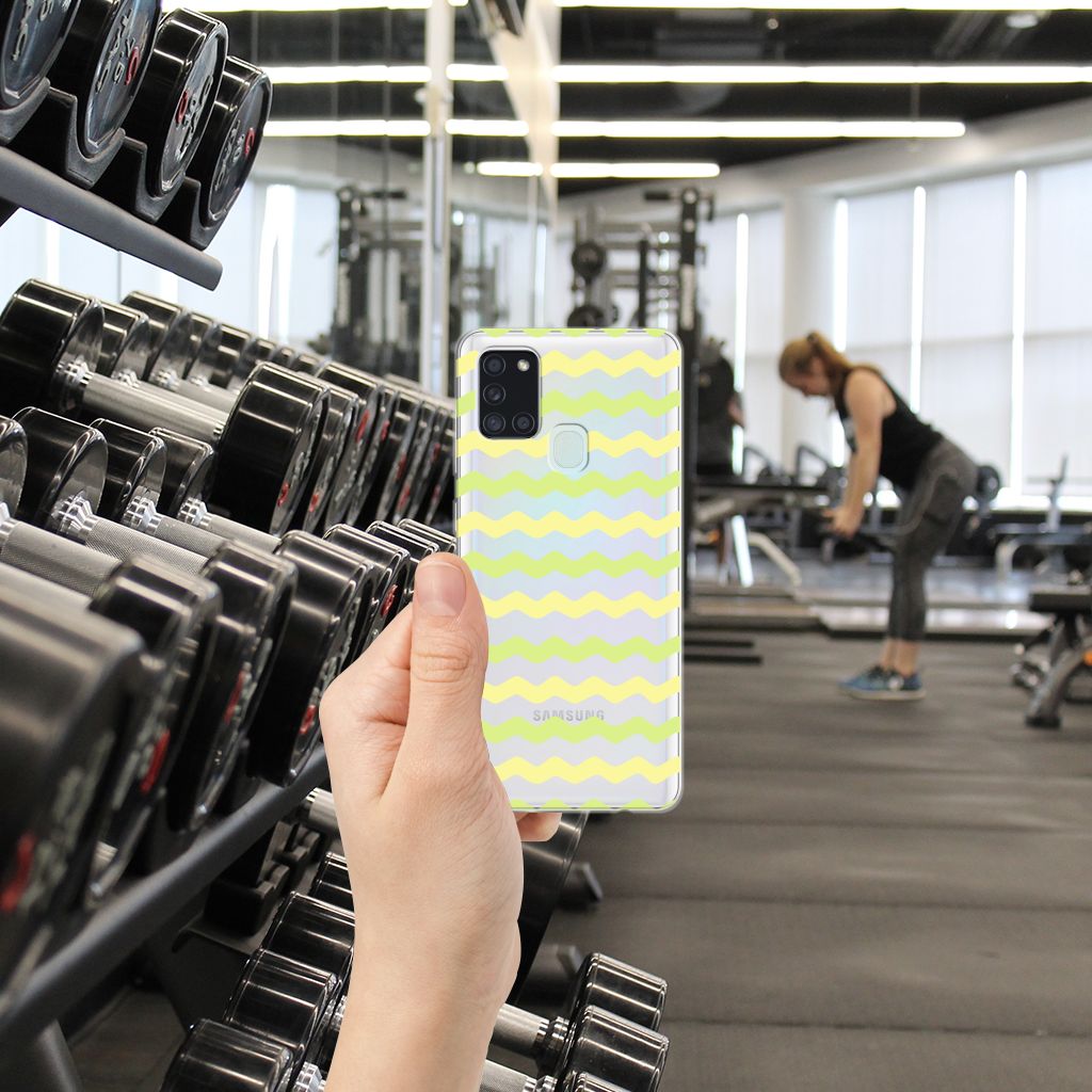 Dit Waves Yellow design hoesje met licht groene en gele golven is speciaal ontworpen voor jouw telefoon. We hebben een vleugje lichtgeel toegevoegd, zodat de case er een beetje spannender en leuker uitziet. Dit licht groene hoesje met licht groene golven ziet er oogstrelend uit. Het wordt in ons eigen magazijn bedrukt, in zeer goede kwaliteit inkt. Wij kunnen dus een zeer duurzaam hoesje met licht groene golven garanderen. Dit hele mooie Samsung Galaxy A21s TPU bumper heeft vele extra’s. Is dit licht groene design hoesje je op het lijf geschreven? Grijp dan nu je kans. Deze TPU case met lichtgroene golven wordt alleen aan de bovenkant bedrukt en is zeer flexibel. De randen van het hoesje met licht groene golven blijven transparant en worden niet bedrukt. Met dit hoesje past jouw telefoon altijd in je broekzak.