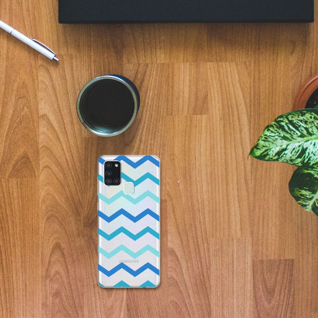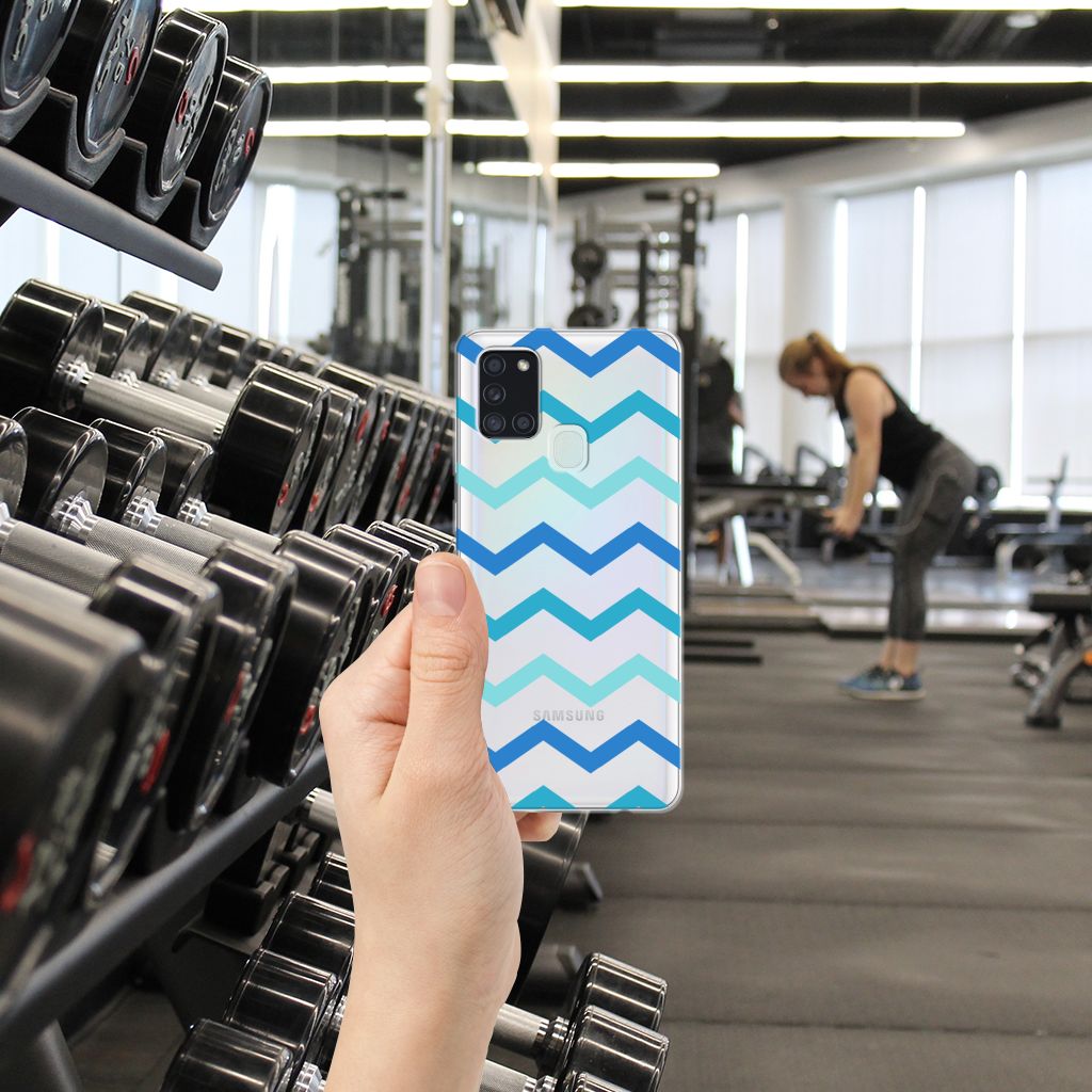 Dit zigzag blauwe design hoesje is speciaal ontworpen voor jou. We hebben bewust verschillende stijlen blauw gebruikt, zodat er voldoende sprake is van variatie. Dit blauwwitte TPU bumper ziet er super strak uit. Dat kan ook niet anders, als je weet dat onze zeer talentvolle designer er hoogstpersoonlijk voor verantwoordelijk is. Hij schudt wekelijks nieuwe designs uit zijn mouw en dit zigzag blauwe hoesje is een van zijn fraaiste creaties. Een heel dik design hoesje, al zeggen we het zelf. Valt dit blauwwitte design hoesje goed bij jou? Bestel het dan vandaag nog en je hebt het morgen in huis. Het design staat op een TPU case. Dit hoesje wordt alleen aan de bovenkant bedrukt en is zeer flexibel. De randen van het hoesje blijven transparant en worden niet bedrukt. Met dit hoesje past jouw Samsung Galaxy A21s altijd in je broekzak.