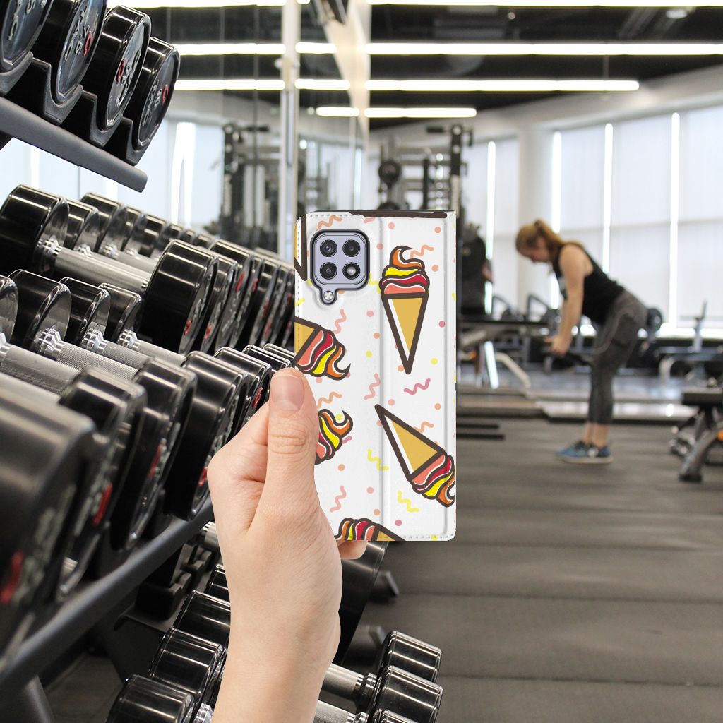 Een vrolijke Samsung Galaxy A22 4G | M22 Flip Style Cover met daarop verschillende ijsjes. Als je daar geen zomers gevoel meer van krijgt, weten wij het ook niet meer. De zomer en ijsjes zijn onlosmakelijk met elkaar verbonden. Tijdens een bezoekje aan het strand mag een lekker ijsje bijvoorbeeld niet ontbreken. Een design hoesje met lekkere Icecream print past daar natuurlijk ook ontzettend goed bij. Jouw telefoon is helemaal beschermd met een stand case met ijsjes design. De aankoop van deze case is een heerlijke investering, die zich gegarandeerd terugbetaalt. Alle zijden van dit hoesje worden bedrukt met ijsjes. De case heeft een speciale standaard en de houder aan de binnenzijde is van TPU. Onder alle weersomstandigheden zal deze case met opbergvakje perfect functioneren, ook in de zomer met een ijsje in je hand. Dit smaakvolle hoesje is zeer goedkoop te bestellen en wordt zeer snel bezorgd.