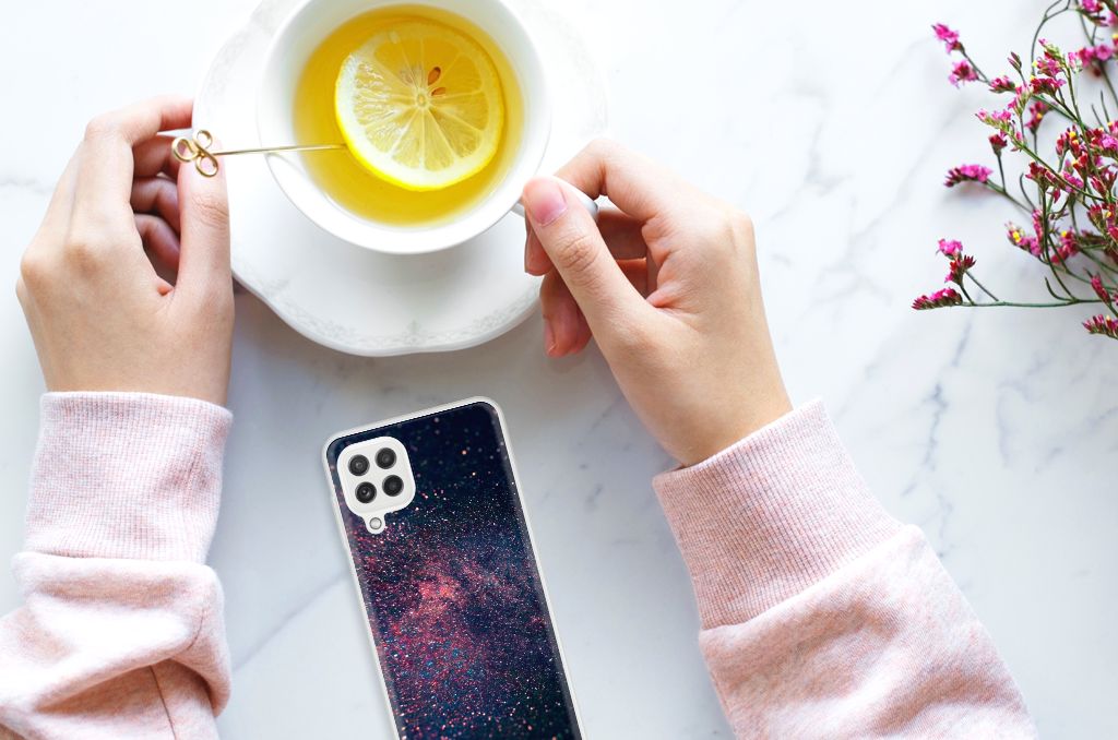 Je waant je in de zevende hemel met dit kunstzinnige, glitterachtige design hoesje met paarse en blauwe kleuren tegen een inktzwarte achtergrond. Het smartphone hoesje heeft ook een wat science fiction achtige allure. Met deze design Stars case zul je zeker opvallen. Als dit je bedoeling is, bestel dat snel dit waanzinnig mooie product voor je Samsung Galaxy A22 4G | M22. Het telefoonhoesje is van alle gemakken voorzien en combineert een hele fraaie uitstraling met maximaal comfort. Bovendien is het gemaakt van zeer stevig en flexibel materiaal. Het unieke design, door B2C Telecom ontworpen, staat op een TPU Hoesje. Dit hoesje wordt alleen aan de bovenkant bedrukt en is zeer flexibel. De randen van het hoesje blijven transparant en worden niet bedrukt. Met dit hoesje past jouw telefoon altijd in je broekzak.
