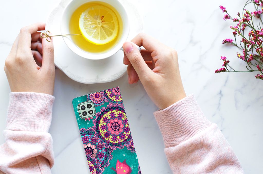 Samsung Galaxy A22 5G Telefoonhoesje met Pasjes Pauw met Bloemen