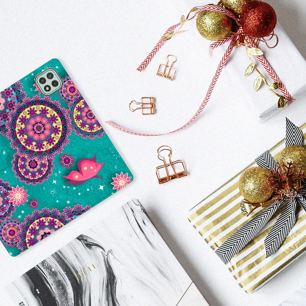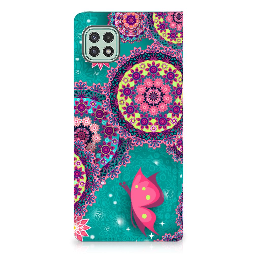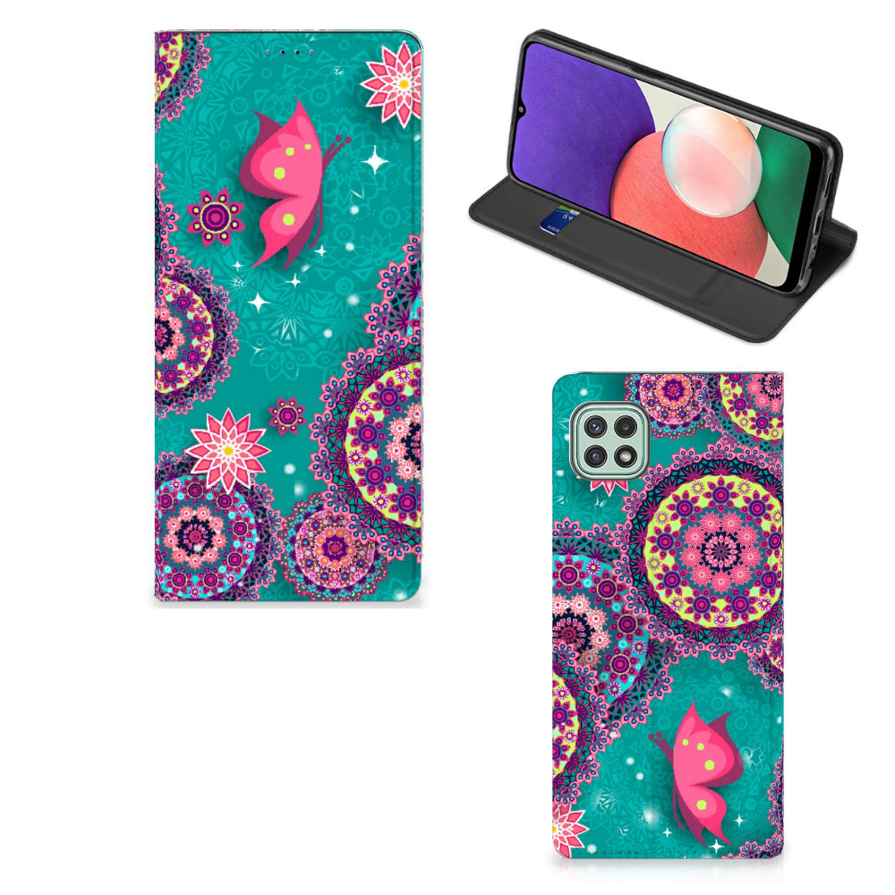 Deze opvallende Samsung Galaxy A22 5G Bookcase met Cirkels en Vlinders is een ware eyecatcher. De meeste vlinders hebben een onopvallende vleugelkleur en dat kun je van de soort op dit hoesje ook zeker wel zeggen. Wij kunnen deze opvallende vlinders en cirkels op een zeer handige stand case zetten. Deze hoesjes zijn zeer gewild. Met onze geavanceerde printer zetten we de print van opvallende vlinders en cirkels op alle zijden van het hoesje. De case met vlinders heeft aan de binnenkant een houder waarin je jouw creditcard of ander pasje kwijt kunt. De case heeft bovendien een handige standaard. Verder is je telefoon natuurlijk maximaal beschermd met deze stand case met print van opvallende en kleurrijke vlinders. De houder aan de binnenzijde van het design hoesje met opvallende vlinder print is van TPU.