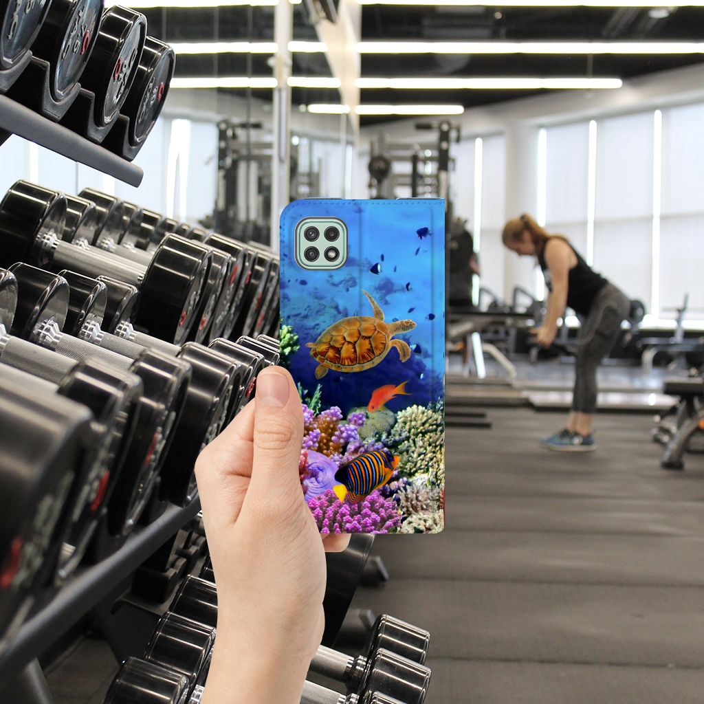 Dit kleurrijke hoesje met tropische Vissen is een ware eyecatcher. Als je aan het duiken bent en je treft een school aan met dit soort opvallende vissen, dan heb je een geweldige ervaring. Maar je hoeft er eigenlijk niet per se het water voor in te duiken. Want wij hebben een schitterende verzameling vissen op dit design hoesje gezet. Met onze zeer geavanceerde printer zetten we de afbeelding van vissen op alle zijden van de Samsung Galaxy A22 5G Hoesje maken. De case heeft aan de binnenkant een vakje waarin je jouw creditcard of ander pasje kwijt kunt. Ga je een dagje vissen, dan hoef je de portemonnee dus ook niet op zak te hebben. Verder is je telefoon natuurlijk maximaal beschermd met deze stand case met print van tropische vissen. De houder aan de binnenzijde van het design hoesje met vissen print is van TPU.