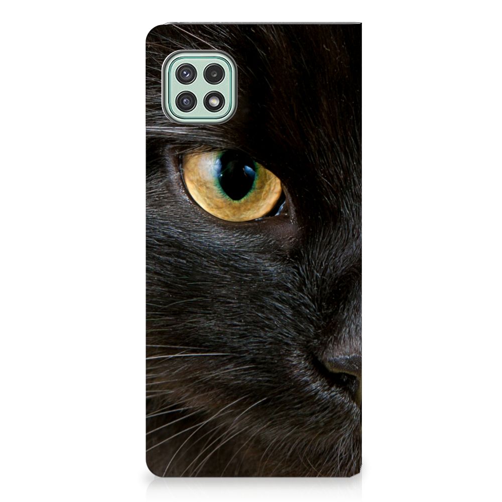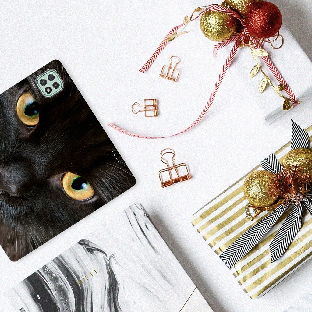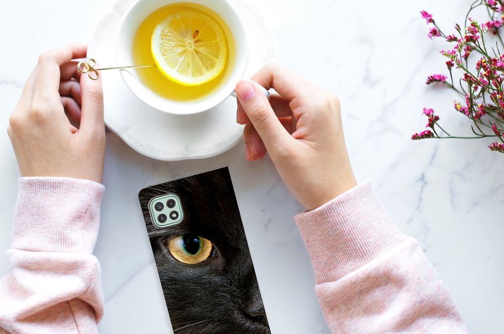 warte katten zijn heel speciaal, vandaar we een exemplaar op een design hoesje hebben gezet. Een zwarte kat schijnt bijvoorbeeld veel beter te kunnen horen dan witte katten. Deze zwarte kat staat op zeer prominente wijze op een stand case. Een Samsung Galaxy A22 5G Hoesje maken met zwarte kat beschermt jouw smartphone aan alle zijden en wordt ook volledig bedrukt. De stand case met zwarte kat ziet er geweldig uit en is voorzien van verschillende uitsparingen en een speciale standaard. Alle zijden van de case zijn bedrukt. Dit design hoesje is van TPU aan de binnenzijde en zeer flexibel. Verder heeft de case een houder voor een pasje.