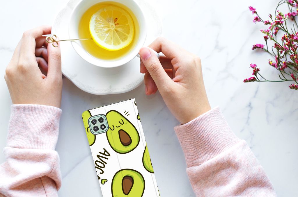 Avocado’s zijn niet alleen heel erg goed voor je, ze zijn ook super leuk op je telefoonhoesje. Dit unieke design vol schattige avocado’s zal jou en iedereen om je heen meteen opvrolijken. Nog een voordeel van dit design: deze avocado’s bederven nooit! Dit leuke Avocado Singing-ontwerp staat op een Magnet Case voor de Samsung Galaxy A22 5G. Dit populaire smartphonehoesje heeft één vakje en is aan alle zijden bedrukt. Met de standcase zet je je telefoon gemakkelijk neer, zodat je je handen vrij hebt als je bijvoorbeeld filmpjes bekijkt. De binnenkant van de standcase is van grijs PU-leer. Dat is ideaal, omdat je daardoor niet snel vlekken ziet op je hoesje.
