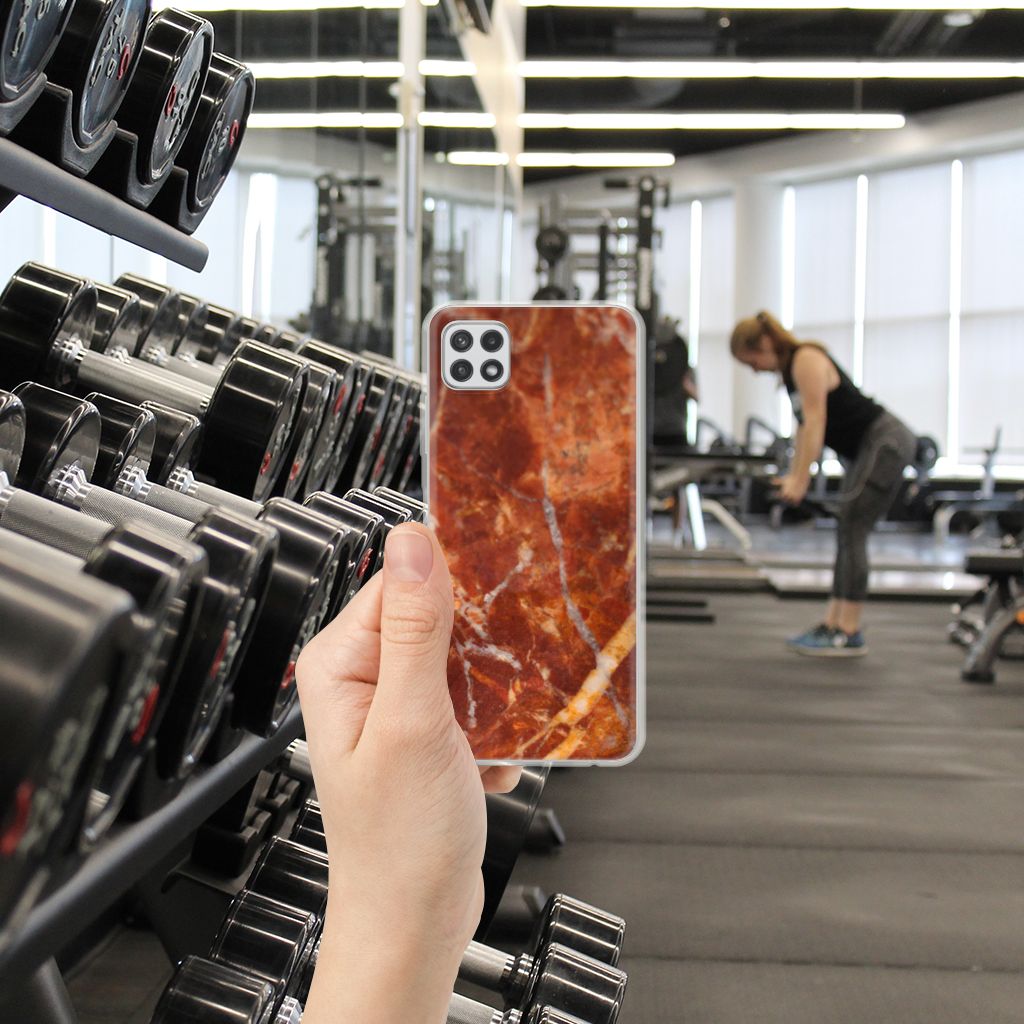 Dit design hoesje met Marmer Bruin is voor de artistieke personen onder ons. De Grieken en Romeinen wisten het al te waarderen door het als bouw- en bekledingsmateriaal toe te passen. Naast het witte Carrara marmer met haar zacht grijze geaderde belijning zijn de diverse soorten in een ruim kleurenpallet te krijgen. We hebben verschillende kleuren op design hoesjes gezet, zoals in dit geval bruin marmer. Dit is een Samsung Galaxy A22 5G TPU Siliconen Hoesje met marmer in bruine kleur. Het marmer wordt bedrukt op de voorkant van een tpu case, die beschikt over opstaande randen aan de voorkant en heel goed combineert met een screenprotector. De rijkheid aan kleuren en varianties in afwerking geeft ontwerpers de vrijheid om met marmer hele mooie architectonische projecten te realiseren. Wij hebben onze designer ook veel vrijheid gegeven. Het resultaat zie je terug in deze tpu case met bruin marmer, die jouw smartphone goed beschermt. De zijkanten van de case worden niet bedrukt met marmer.