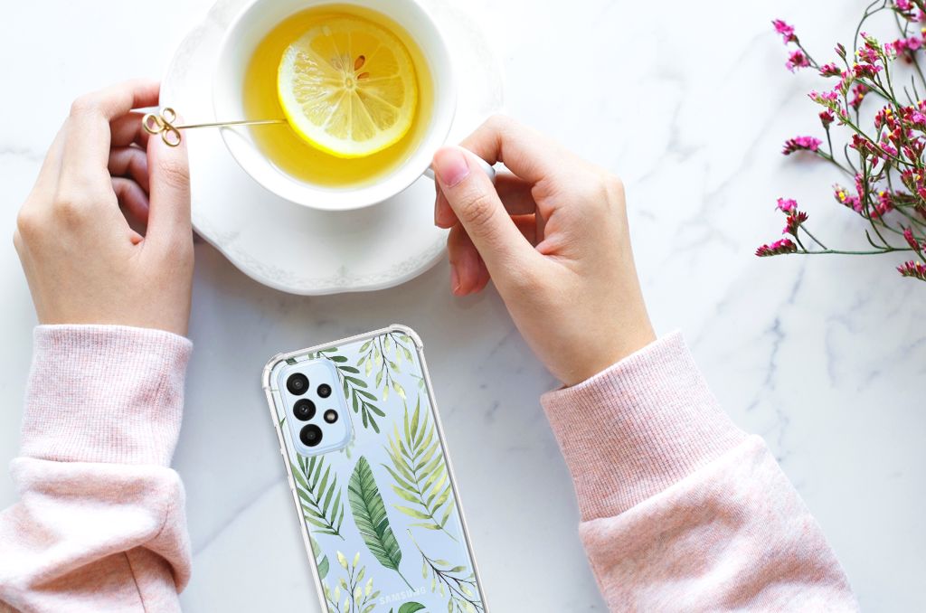 Ben je op zoek naar een uniek telefoonhoesje voor je Samsung Galaxy A23? Dan ben je bij B2C Telecom aan het juiste adres! Speciaal voor jou hebben we dit prachtige Leaves design in onze collectie hoesjes opgenomen. Het design wordt bedrukt op een Case en is gemaakt van flexibel rubber. Het hoesje is perfect voor de actieve smartphonegebruiker door de opstaande randen/hoeken. Denk aan mensen die veel sporten, reizen of wandelen en net iets meer zekerheid willen als het op hun geliefde telefoon aankomt. Het design wordt alleen aan de bovenkant van het hoesje bedrukt en de randen blijven transparant. Aan de zijkanten zijn uitsparingen gemaakt waardoor je met gemak alle knoppen en poorten kunt bedienen. Wij adviseren om dit hoesje in combinatie met een screenprotector te gebruiken voor een langere levensduur van je telefoon. Wil je dit hoesje nog iets extra's geven? Voeg dan gratis je naam of een quote toe! Is dit design hoesje toch niet helemaal wat je zocht? Ontwerp dan zelf een hoesje in ons ontwerpprogramma.