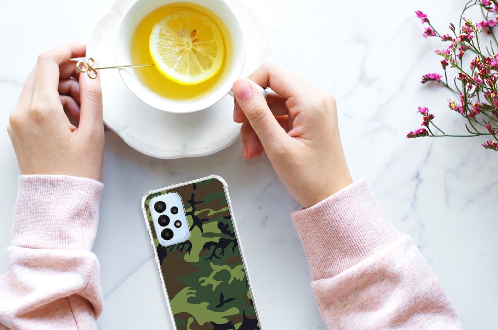 Ben je op zoek naar een uniek telefoonhoesje voor je Samsung Galaxy A23? Dan ben je bij B2C Telecom aan het juiste adres! Speciaal voor jou hebben we dit prachtige Army Dark design in onze collectie hoesjes opgenomen. Het design wordt bedrukt op een Doorzichtige Silicone Hoesje en is gemaakt van flexibel rubber. Het hoesje is perfect voor de actieve smartphonegebruiker door de opstaande randen/hoeken. Denk aan mensen die veel sporten, reizen of wandelen en net iets meer zekerheid willen als het op hun geliefde telefoon aankomt. Het design wordt alleen aan de bovenkant van het hoesje bedrukt en de randen blijven transparant. Aan de zijkanten zijn uitsparingen gemaakt waardoor je met gemak alle knoppen en poorten kunt bedienen. Wij adviseren om dit hoesje in combinatie met een screenprotector te gebruiken voor een langere levensduur van je telefoon. Wil je dit hoesje nog iets extra's geven? Voeg dan gratis je naam of een quote toe! Is dit design hoesje toch niet helemaal wat je zocht? Ontwerp dan zelf een hoesje in ons ontwerpprogramma.