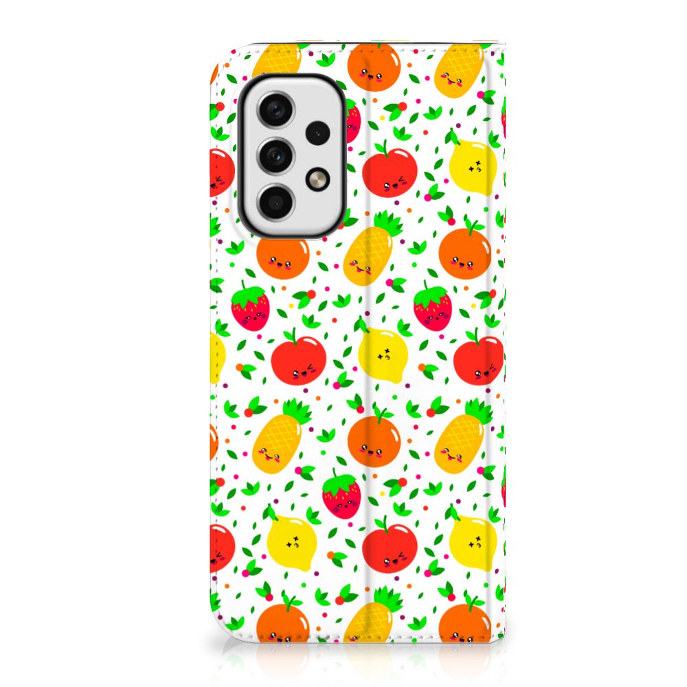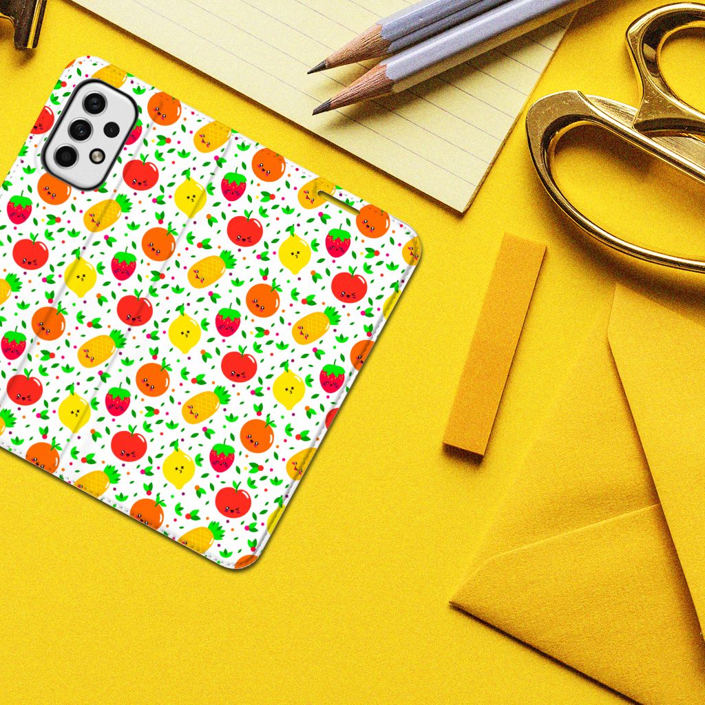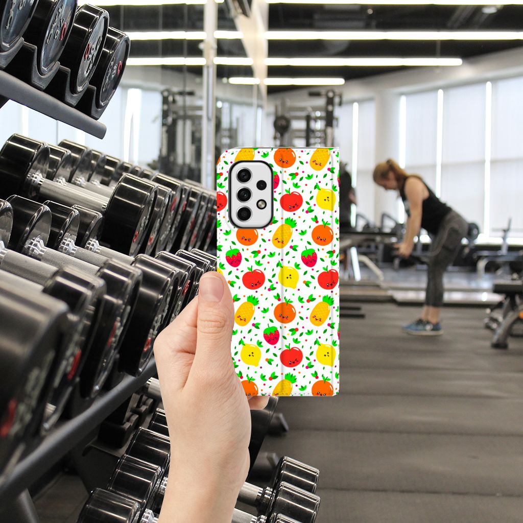 Een fris, fruitig en vrolijk hoesje, deze case met afbeeldingen van aardbeien, ananassen, appels, sinaasappels en citroenen. Minstens twee stuks fruit per dag wordt aanbevolen als dagelijkse hoeveelheid voor de mens. Dit verkleint de kans op allerlei ziekten. Dus met het aantal stukken fruit op de Samsung Galaxy A23 Flip Style Cover zou je wel een maandje zoet moeten zijn. Met het hoesje zelf kun je je hele leven doen, dit is namelijk niet stuk te krijgen. Dit komt door het sterke en flexibele materiaal waarvan het gemaakt is. De vrolijk stemmende case het desing Fruits maakt jouw telefoon dus zeer duurzaam. Zorg ervoor dat jouw smartphone gezond blijft en kies voor dit hoesje met frivool fruit. Een stand case met fruit beschermt jouw telefoon aan alle kanten en beschikt over een 1 opbergvakje en een speciale standaard. Het hoesje met fruit wordt afgesloten met een magneet aan de binnenzijde. De houder aan de binnenzijde is van TPU.