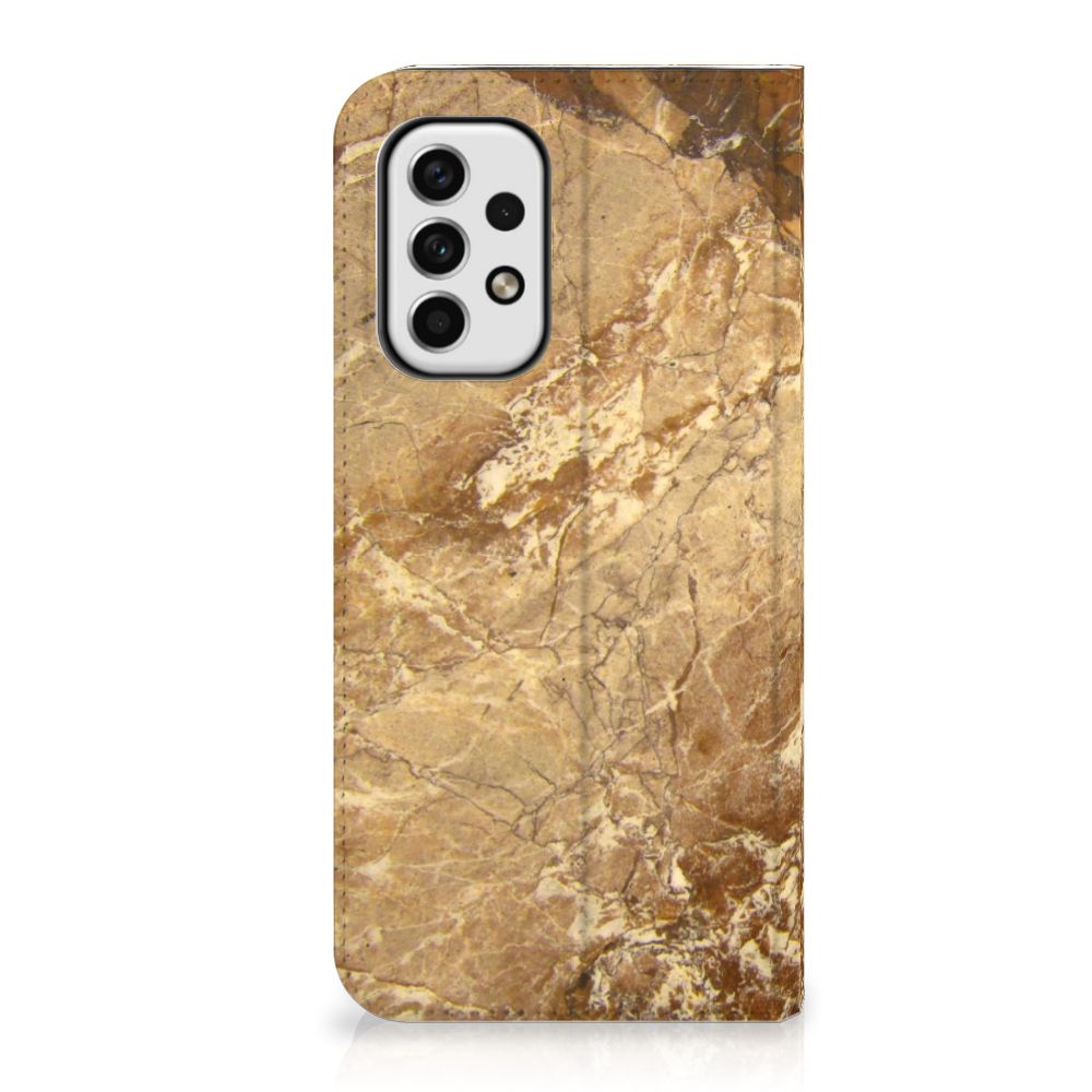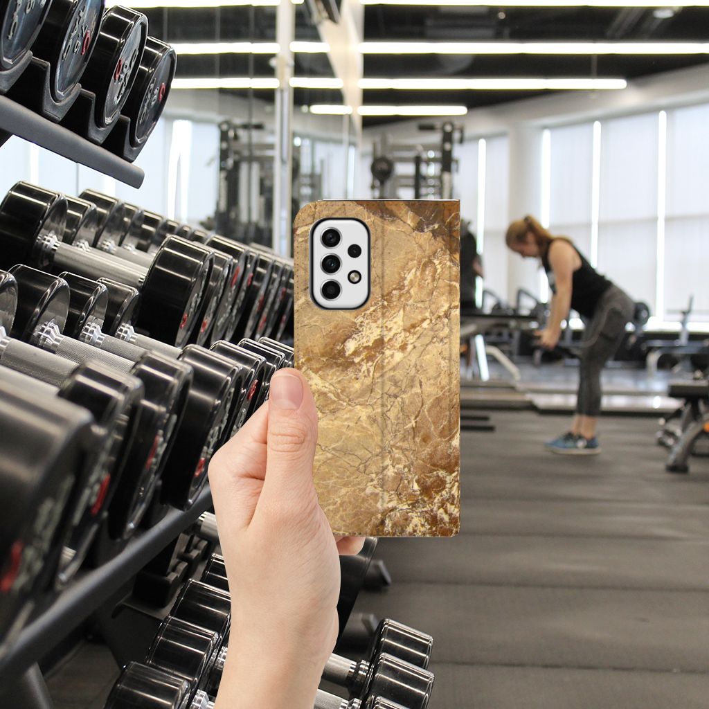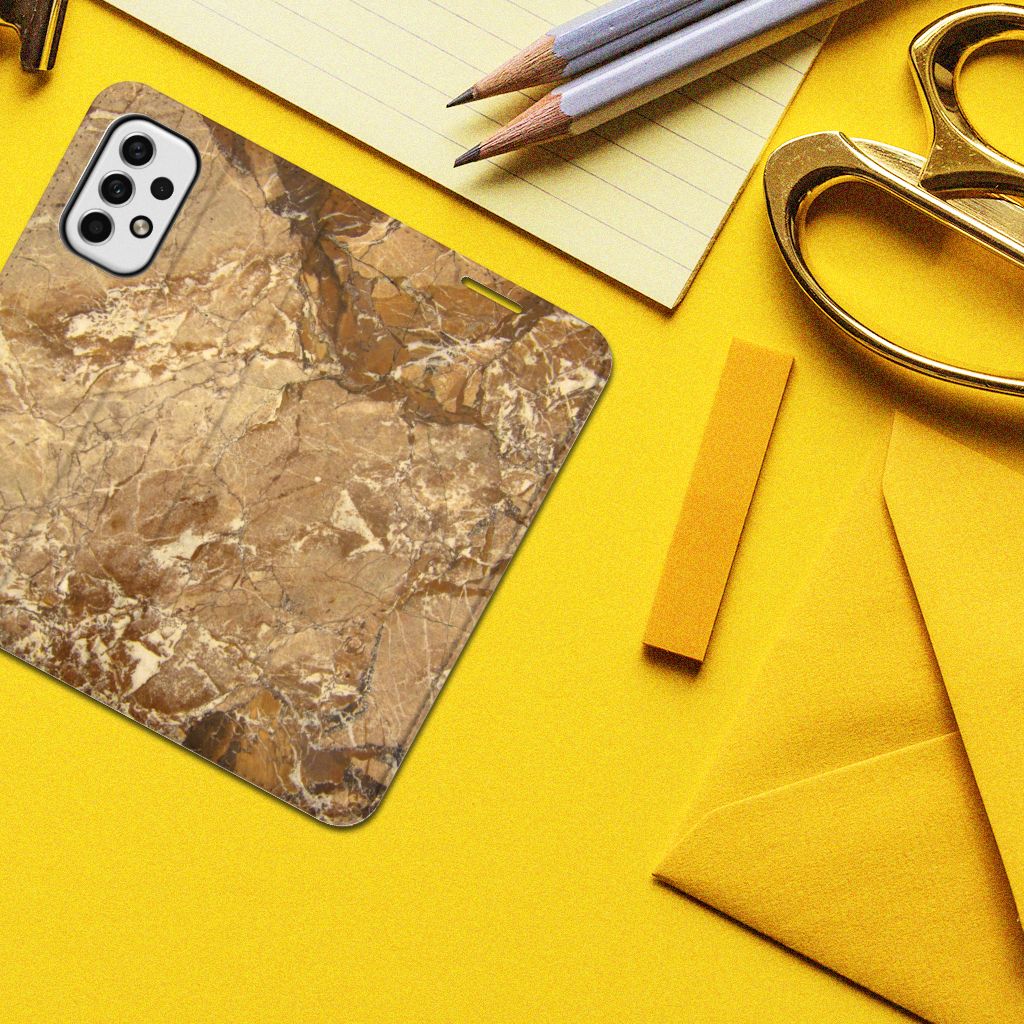 Dit design hoesje met Marmer in lichtbruine kleur is voor de artistiekelingen onder ons. De Grieken en Romeinen wisten het marmer al te waarderen door het in de bouw toe te passen. Naast het witte marmer zijn de diverse soorten marmer in een gevarieerde kleurensamenstelling te krijgen. We hebben verschillende mooie kleuren op design hoesjes gezet, zoals in dit geval het lichtbruine marmer. Dit is een Samsung Galaxy A23 Standcase met marmer in lichtbruine kleur. Het marmer wordt bedrukt op alle zijden van een stand case, die beschikt over 1 vakje voor een pasje en een magnetische sluiting aan de binnenzijde. Verder heeft de hoes een houder van TPU. Door de rijkdom aan kleuren en varianties in afwerking kunnen ontwerpers met marmer schitterende architectonische projecten realiseren. Wij hebben hetzelfde gedaan en onze ontwerper veel vrijheid geboden. Het resultaat zie je terug in deze stand case met lichtbruin marmer, dat de ideale bescherming voor jouw smartphone is.