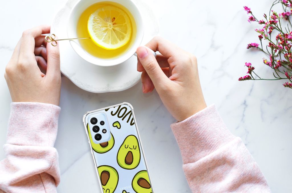 Ben je op zoek naar een uniek telefoonhoesje voor je Samsung Galaxy A23? Dan ben je bij B2C Telecom aan het juiste adres! Speciaal voor jou hebben we dit prachtige Avocado Singing design in onze collectie hoesjes opgenomen. Het design wordt bedrukt op een Stevig Bumper Hoesje en is gemaakt van flexibel rubber. Het hoesje is perfect voor de actieve smartphonegebruiker door de opstaande randen/hoeken. Denk aan mensen die veel sporten, reizen of wandelen en net iets meer zekerheid willen als het op hun geliefde telefoon aankomt. Het design wordt alleen aan de bovenkant van het hoesje bedrukt en de randen blijven transparant. Aan de zijkanten zijn uitsparingen gemaakt waardoor je met gemak alle knoppen en poorten kunt bedienen. Wij adviseren om dit hoesje in combinatie met een screenprotector te gebruiken voor een langere levensduur van je telefoon. Wil je dit hoesje nog iets extra's geven? Voeg dan gratis je naam of een quote toe! Is dit design hoesje toch niet helemaal wat je zocht? Ontwerp dan zelf een hoesje in ons ontwerpprogramma.
