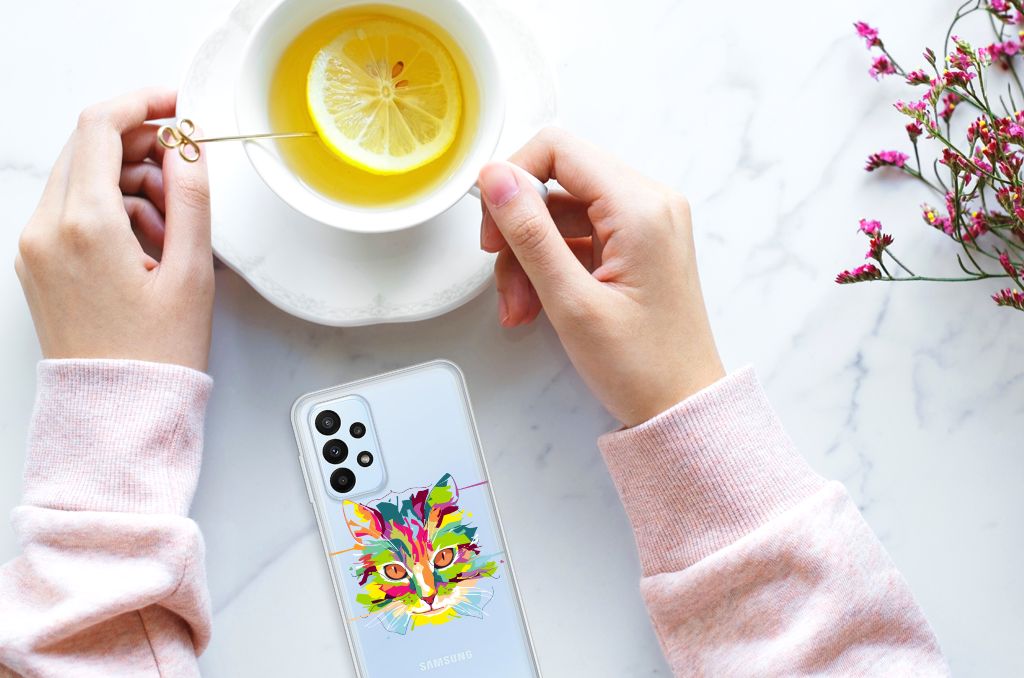 Ben je op zoek naar een uniek telefoonhoesje voor je Samsung Galaxy A23? Dan ben je bij B2C Telecom aan het juiste adres! Speciaal voor jou hebben we dit prachtige Cat Color design in onze collectie hoesjes opgenomen. Het design wordt bedrukt op een Telefoonhoesje met Naam en is gemaakt van flexibel rubber. Het design wordt alleen aan de bovenkant van het hoesje bedrukt en de randen blijven transparant. Aan de zijkanten zijn uitsparingen gemaakt waardoor je met gemak alle knoppen en poorten kunt bedienen. Wij adviseren om dit hoesje in combinatie met een screenprotector te gebruiken voor een langere levensduur van je telefoon. Wil je dit design hoesje nog iets extra's geven? Voeg dan gratis je naam of een quote toe! Is dit design hoesje toch niet helemaal wat je zocht? Ontwerp dan zelf een hoesje in ons ontwerpprogramma.