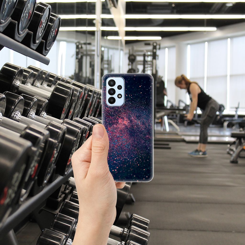Je waant je in de zevende hemel met dit kunstzinnige, glitterachtige design hoesje met paarse en blauwe kleuren tegen een inktzwarte achtergrond. Het smartphone hoesje heeft ook een wat science fiction achtige allure. Met deze design Stars case zul je zeker opvallen. Als dit je bedoeling is, bestel dat snel dit waanzinnig mooie product voor je Samsung Galaxy A23. Het telefoonhoesje is van alle gemakken voorzien en combineert een hele fraaie uitstraling met maximaal comfort. Bovendien is het gemaakt van zeer stevig en flexibel materiaal. Het unieke design, door B2C Telecom ontworpen, staat op een TPU Hoesje. Dit hoesje wordt alleen aan de bovenkant bedrukt en is zeer flexibel. De randen van het hoesje blijven transparant en worden niet bedrukt. Met dit hoesje past jouw telefoon altijd in je broekzak.