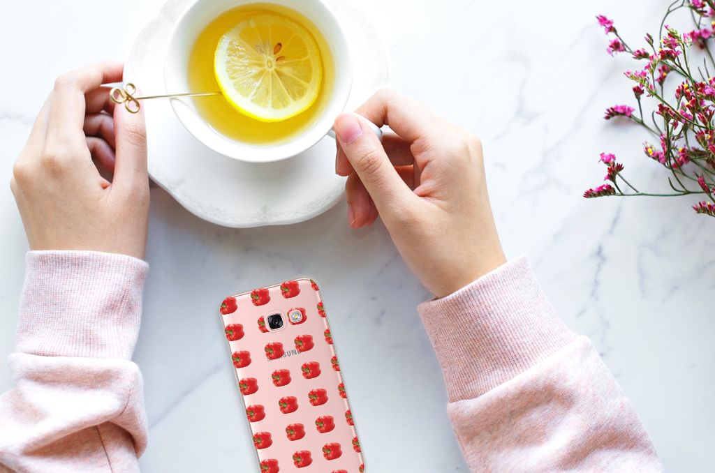 Er zit pit in jouw Samsung Galaxy A3 2017 Siliconen Case dankzij dit design met rode paprika’s. Paprika’s zijn er in allerlei kleuren en vormen en ze hebben gemeen dat ze heel erg gezond zijn. De rode paprika’s op deze case staan op een grijs met witte geblokte achtergrond en vormen een opvallende verschijning. Heb jij ooit iemand in je nabije omgeving rond zien lopen met een design hoesje met rode paprika’s? Waarschijnlijk niet. Dit hoesje wordt alleen aan de bovenkant bedrukt met paprika’s en is zeer flexibel. De randen van het hoesje blijven transparant en worden niet bedrukt. Met dit hoesje past jouw telefoon altijd in je broekzak. Zeker weten dat je met dit hoesje met rode paprika’s een smartphone accessoire te pakken hebt waarmee je jezelf in de schijnwerpers zet. Als je andere kleuren paprika’s op je hoesje wilt, raden we je aan ons assortiment design hoesjes te bekijken of zelf een hoesje te ontwerpen.