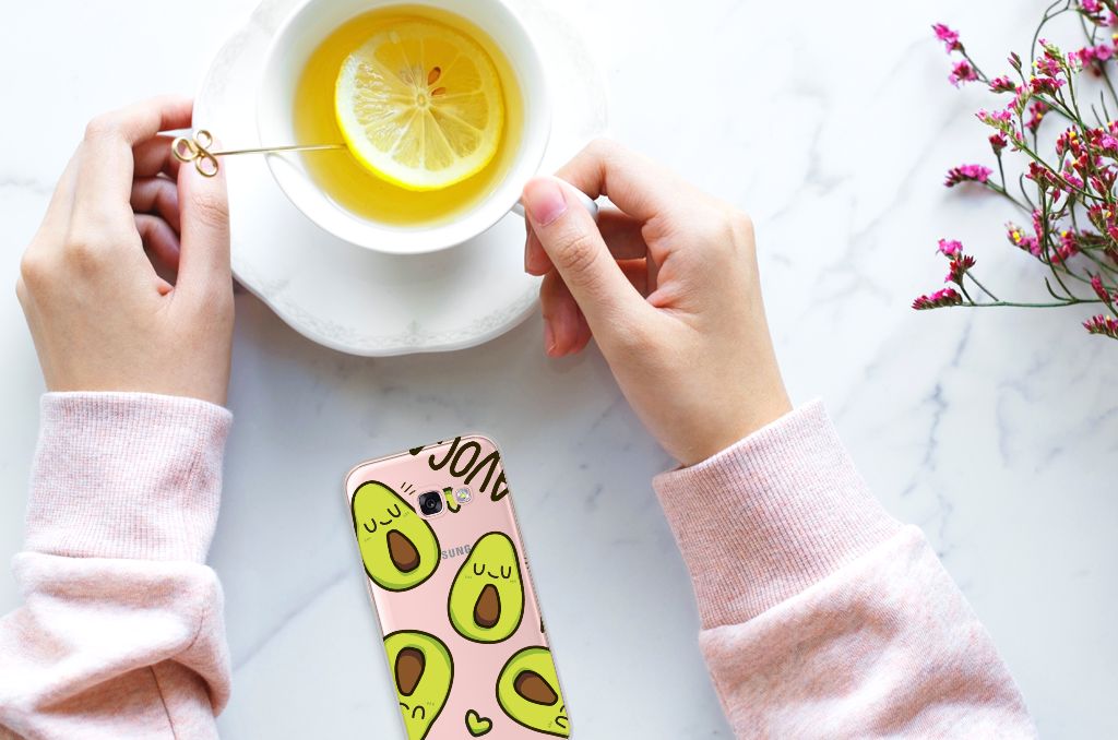 Avocado’s zijn niet alleen heel erg goed voor je, ze zijn ook super leuk op je telefoonhoesje. Dit unieke design vol schattige avocado’s zal jou en iedereen om je heen meteen opvrolijken. Nog een voordeel van dit design: deze avocado’s bederven nooit! Dit leuke Avocado Singing-ontwerp staat op een Telefoonhoesje met Naam voor de Samsung Galaxy A3 2017. Met deze vrolijke groene vruchten op je hoesje val jij zeker op. TPU is flexibel en onbreekbaar. Zo is je telefoon aan de achterkant en de randen heel goed beschermd. De case is aan de bovenkant bedrukt, de randen blijven transparant. Het TPU-hoesje is perfect te combineren met een screenprotector, zo zijn je telefoon en je beeldscherm perfect beschermd.