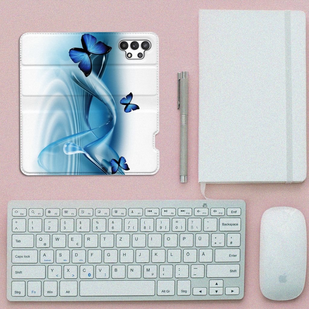 Deze vrolijke Samsung Galaxy A32 4G | A32 5G Enterprise Editie Hoesje maken met blauwe vlinders is een ware eyecatcher. De meeste vlinders hebben een onopvallende vleugelkleur, andere soorten hebben juist heldere en felle kleuren. Wij kunnen deze blauwe vlinders op een zeer handige stand case zetten. Deze hoesjes zijn het meest gewild. Met onze geavanceerde printer zetten we de afbeelding van vlinders op alle zijden van het hoesje. De case met vlinders heeft aan de binnenkant een houder waarin je jouw creditcard of ander pasje kwijt kunt. De case heeft bovendien een handige standaard. Verder is je telefoon natuurlijk maximaal beschermd met deze stand case met print van blauwe vlinders. De houder aan de binnenzijde van het design hoesje met vlinder print is van TPU.