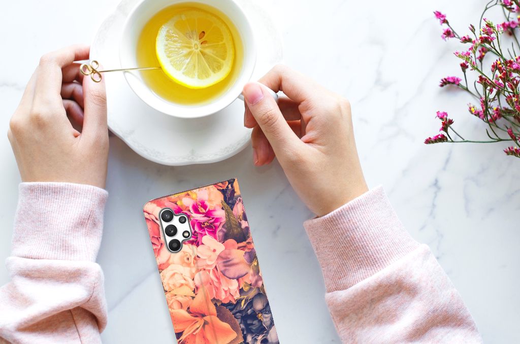 Dit Bosje Bloemen doet een mens en zijn smartphone goed. De oranje, paarse en roze bloemen op deze Samsung Galaxy A32 4G | A32 5G Enterprise Editie Smart Cover geven jouw smartphone een zeer sierlijke uitstraling. Je wordt er ook meteen vrolijker van als je aan het appen, mailen of aan het bellen bent. Valt dan je telefoon op de grond, dan zal er dankzij de stand case met oranje, paarse en roze bloemen geen schade ontstaan. Onze stand cases met oranje, paarse en roze bloemen bieden de allerbeste bescherming en zijn heel praktisch, wat blijkt uit onder meer het vakje aan de binnenkant en de handige standaard waarmee je de smartphone rechtop op tafel neer kunt zetten. De oranje, paarse en roze bloemen passen goed op alle zijden van de case. Op deze stand case van leer en TPU (houder aan de binnenkant) is het ook mogelijk je eigen ontwerp te zetten. In no time maak je zelf een stand case met daarop foto’s van jouw favoriete bloemen.