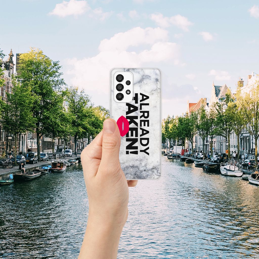 Stel dat je opdringende vrouwen of mannen van je af wil schudden op het moment dat je aan het feesten bent, omdat je al een partner hebt. Dan kun je dat met dit hoesje uitstekend duidelijk maken. Je Samsung Galaxy A33 5G neem je waarschijnlijk vaak ter hand, dus dan zal de boodschap als je over dit hoesje beschikt zeker weten overkomen. Ook in het openbaar vervoer zal dit hoesje ervoor zorgen dat je minder snel versierd wordt door het andere geslacht. Als je vrijgezel bent en op zoek naar gezelschap, dan kun je beter kiezen voor een ander hoesje uit ons ruime en gevarieerde assortiment. Het design Already Taken White staat op een Siliconen hoesje met naam. Dit hoesje wordt alleen aan de bovenkant bedrukt en is zeer flexibel. De randen van het hoesje blijven transparant.