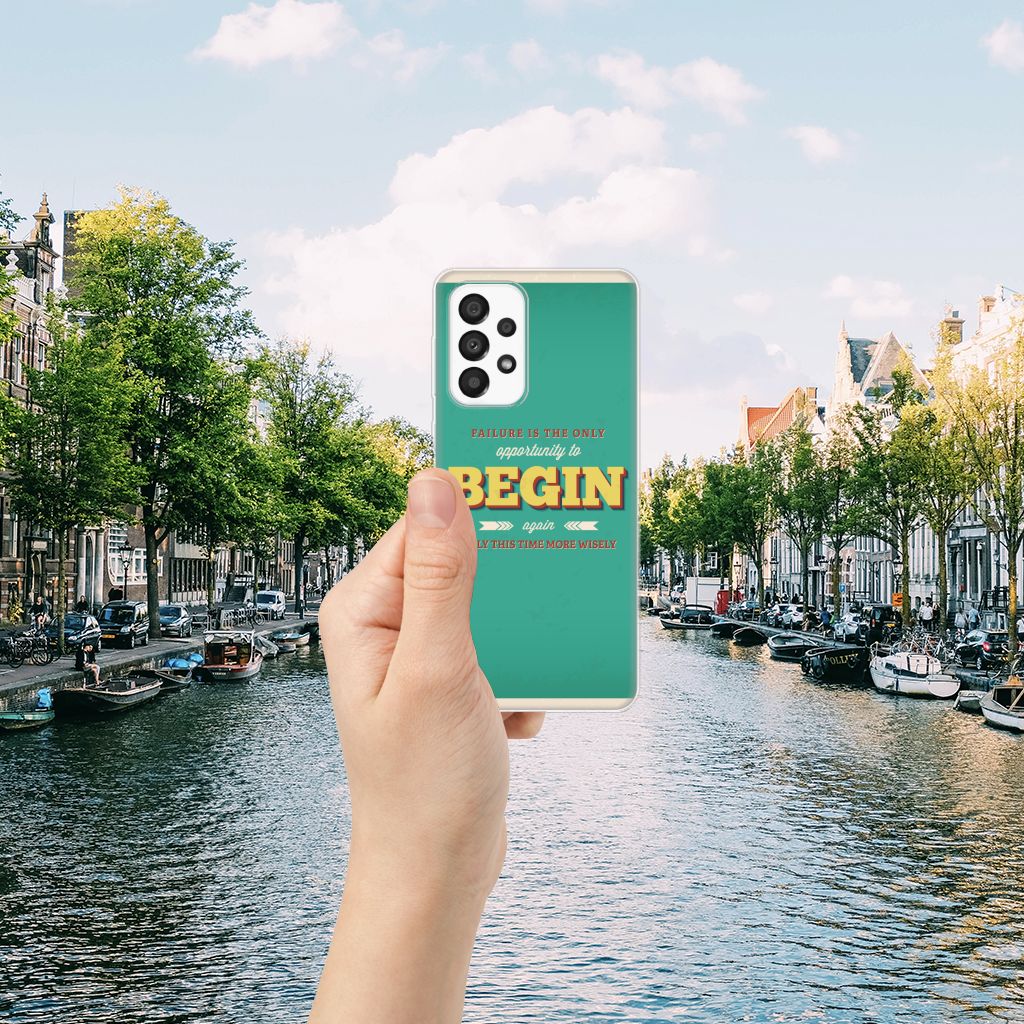 Ben je op zoek naar een uniek telefoonhoesje voor je Samsung Galaxy A33 5G? Dan ben je bij B2C Telecom aan het juiste adres! Speciaal voor jou hebben we dit prachtige Quote Begin design in onze collectie hoesjes opgenomen. Het design wordt bedrukt op een Siliconen hoesje met naam en is gemaakt van flexibel rubber. Het design wordt alleen aan de bovenkant van het hoesje bedrukt en de randen blijven transparant. Aan de zijkanten zijn uitsparingen gemaakt waardoor je met gemak alle knoppen en poorten kunt bedienen. Wij adviseren om dit hoesje in combinatie met een screenprotector te gebruiken voor een langere levensduur van je telefoon. Wil je dit design hoesje nog iets extra's geven? Voeg dan gratis je naam of een quote toe! Is dit design hoesje toch niet helemaal wat je zocht? Ontwerp dan zelf een hoesje in ons ontwerpprogramma.
