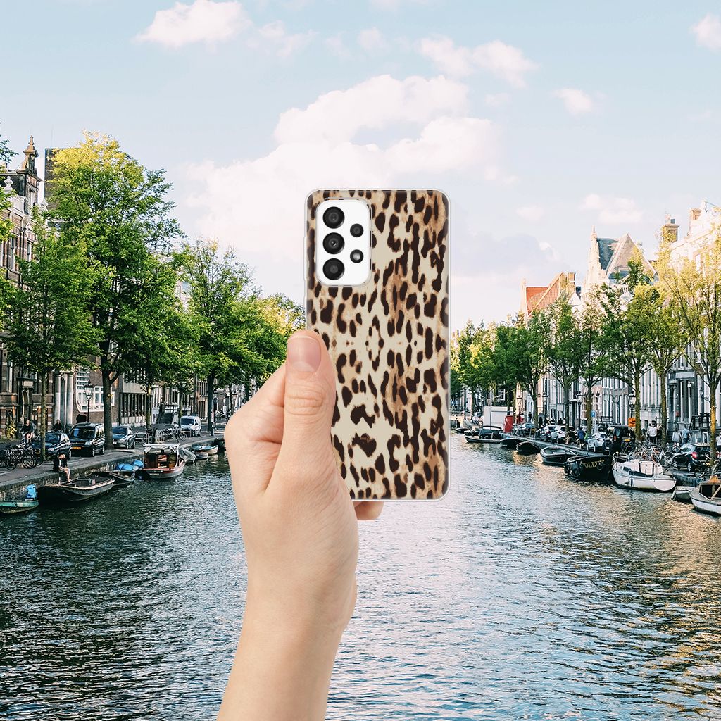 Het luipaard wordt ook wel een panter genoemd. De bruingele vacht met een patroon van rozetachtige vlekken geeft een hele goede schutkleur. Dit zie je ook op een fraaie manier afgebeeld op dit super stoere hoesje met luipaardprint. Mensen die indruk willen maken kopen deze tpu case met Leopard print. Een Samsung Galaxy A33 5G TPU Hoesje is erg flexibel en stevig. Het is praktisch – door het elastische materiaal neem je de telefoon makkelijk met je mee – en beschermt jouw smartphone aan de achterzijde en zijkanten zeer goed. Het luipaard is sterk en behendig en wellicht typeert jou dat ook wel. Dan past dit hoesje met luipaard perfect bij jou. De houder van TPU is minstens zo sterk als het luipaard. Jouw telefoon is zeer goed beschermd. De case heeft alle uitsparingen die nodig zijn. De randen blijven transparant. Enkele de bovenzijde wordt bedrukt met luipaardprint.