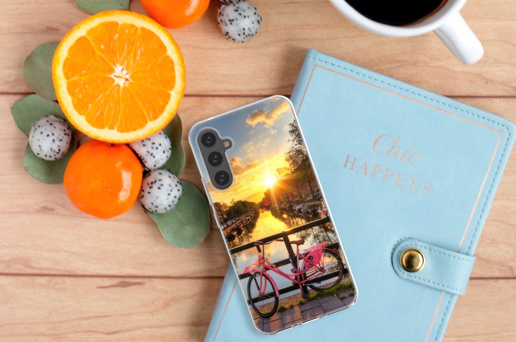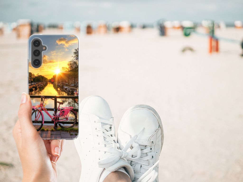 Amsterdam is meer dan ooit een toeristische trekpleister. Een bezoek aan de hoofdstad is niet compleet als je niet aanlegt bij de Amsterdamse Grachten. Ze zijn een symbool van de stad en hebben een enorme culturele en historische waarde. Daarom kunnen ze natuurlijk niet ontbreken in onze collectie design hoesjes. Dit schitterende design hoesje met Amsterdamse grachten tref je enkel en alleen aan bij B2C Telecom. De ondergaande zon en de fleurige en fraaie bloempakketten zorgen voor een prachtig totaalplaatje. Amsterdam is wereldberoemd om haar prachtige grachten uit de zeventiende eeuw. Dit smartphone hoesje is hier een eerbetoon aan. Het design staat op een TPU case. Dit Samsung Galaxy A34 Siliconen Back Cover wordt alleen aan de bovenkant bedrukt en is zeer flexibel. De randen van het hoesje blijven transparant.