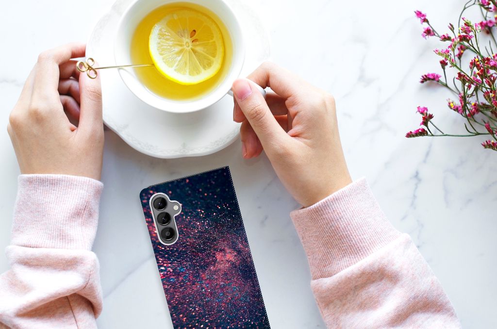 Je waant je in de zevende hemel met dit kunstzinnige, glitterachtige design hoesje met paarse en blauwe kleuren tegen een inktzwarte achtergrond. Het smartphone hoesje heeft ook een wat science fiction achtige allure. Met deze design Stars case zul je zeker opvallen. Als dit je bedoeling is, bestel dat snel dit waanzinnig mooie product voor je Samsung Galaxy A34. Het telefoonhoesje is van alle gemakken voorzien en combineert een hele fraaie uitstraling met maximaal comfort. Bovendien is het gemaakt van zeer stevig en flexibel materiaal. Het unieke design, door B2C Telecom ontworpen, staat op een Stand Case. Deze case beschermt jouw telefoon aan alle kanten en beschikt over een 1 opbergvakje en een speciale standaard. Het hoesje wordt afgesloten met een magneet aan de binnenzijde. De houder aan de binnenzijde is van TPU.
