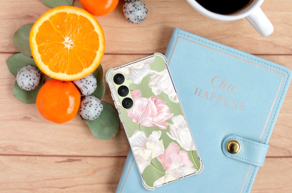 Ben je op zoek naar een uniek telefoonhoesje voor je Samsung Galaxy A35? Dan ben je bij B2C Telecom aan het juiste adres! Speciaal voor jou hebben we dit prachtige Lovely Flowers design in onze collectie hoesjes opgenomen. Het design wordt bedrukt op een Case en is gemaakt van flexibel rubber. Het hoesje is perfect voor de actieve smartphonegebruiker door de opstaande randen/hoeken. Denk aan mensen die veel sporten, reizen of wandelen en net iets meer zekerheid willen als het op hun geliefde telefoon aankomt. Het design wordt alleen aan de bovenkant van het hoesje bedrukt en de randen blijven transparant. Aan de zijkanten zijn uitsparingen gemaakt waardoor je met gemak alle knoppen en poorten kunt bedienen. Wij adviseren om dit hoesje in combinatie met een screenprotector te gebruiken voor een langere levensduur van je telefoon. Wil je dit hoesje nog iets extra's geven? Voeg dan gratis je naam of een quote toe! Is dit design hoesje toch niet helemaal wat je zocht? Ontwerp dan zelf een hoesje in ons ontwerpprogramma.