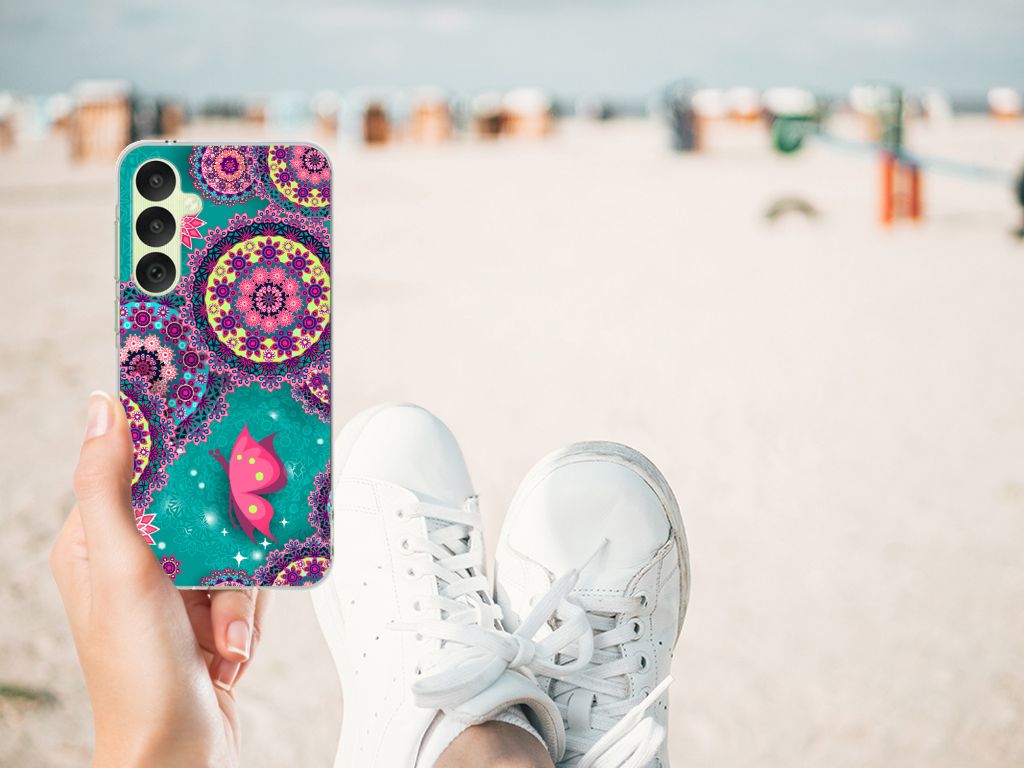 Deze opvallende Samsung Galaxy A35 Hoesje maken met Cirkels en Vlinders is een ware eyecatcher. De meeste vlinders hebben een onopvallende vleugelkleur en dat kun je van de soort op dit hoesje ook zeker wel zeggen. Wij kunnen deze opvallende vlinders en cirkels op een zeer handige tpu case zetten. Deze hoesjes zijn gewild omwille hun flexibiliteit. Met onze geavanceerde printer zetten we de print van opvallende vlinders en cirkels op de achterkant van het hoesje. De case met vlinders en cirkels blijft aan de zijkanten doorzichtig, zodat je maximaal het design van je smartphone behoudt. Verder is je telefoon natuurlijk goed beschermd met deze tpu case met print van blauwe vlinders. De bovenkant wordt bedrukt, de zijkanten niet. Met een screenprotector bescherm je ook het scherm maximaal.