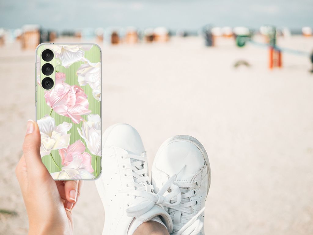 Een bosje bloemen doet een mens (en zijn smartphone) goed. De witte en roze bloemen op deze Samsung Galaxy A35 TPU Case geven jouw smartphone een zeer mooie uitstraling. Je wordt er ook meteen een stuk rustiger van als je aan het appen of aan het bellen bent. Valt dan je telefoon op de grond, dan zal er dankzij de tpu case met het design Lovely Flowers ontstaan. Helemaal niet als je er een screenprotector bij hebt gekocht. Onze tpu cases met roze en witte bloemen zien er zeer prettig uit en zijn heel praktisch, getuige onder meer de opstaande randen en het flexibele materiaal. Alleen de achterkant van de tpu case wordt bedrukt met roze en witte bloemen. Op deze tpu case kun je trouwens ook een eigen ontwerp zetten. In een paar simpele stappen ontwerp je zelf een stand case met daarop jouw favoriete bloemen.