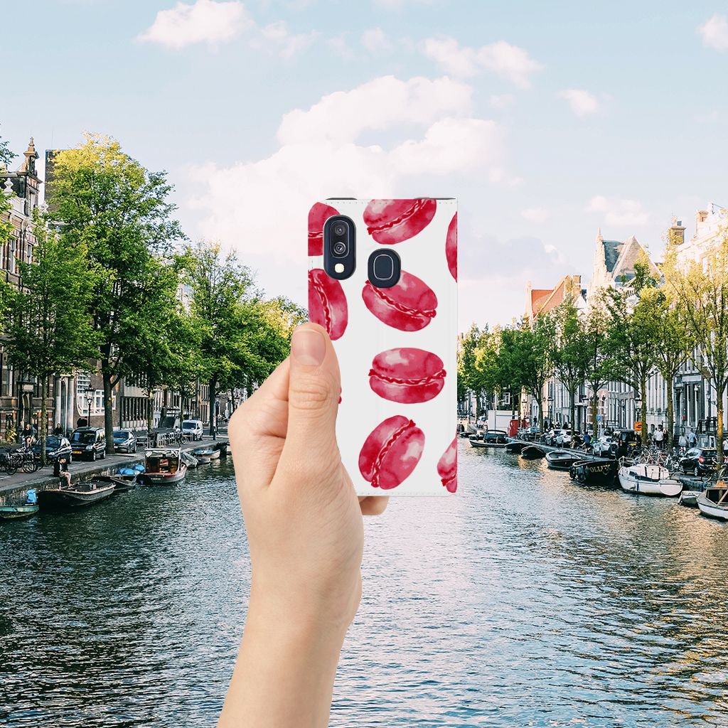 Dit stand hoesje met Pink Macarons is een zeer opvallende bescherming voor jouw smartphone. Macarons zijn Franse koekjes: kleine, rond en luchtig. Ze worden in veel verschillende smaken gemaakt, herkenbaar aan de verschillende kleuren zoals chocolade (donkerbruin), mokka (middenbruin), kersen (rood), pistache (groen), aardbei (roze), framboos (karmijn). Deze kleuren kun je net allemaal zien op dit fraaie design hoesje met roze macarons. Heb je altijd al een Samsung Galaxy A40 Flip Style Cover willen hebben met roze macarons? Grijp dan nu je kans. Deze case heeft zeer veel goede eigenschappen, zoals 1 opbergvakje en een magnetische sluiting aan de binnenkant. Dit design hoesje met roze macarons wordt aan alle zijden bedrukt. De houder aan de binnenkant van het hoesje is van TPU. De case heeft ook een handige standaard.