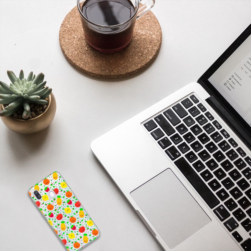 Een fris, fruitig en vrolijk hoesje, deze case met afbeeldingen van aardbeien, ananassen, appels, sinaasappels en citroenen. Minstens twee stuks fruit per dag wordt aanbevolen als dagelijkse hoeveelheid voor de mens. Dit verkleint de kans op allerlei ziekten. Dus met het aantal stukken fruit op de Samsung Galaxy A40 Siliconen Case zou je wel een maandje zoet moeten zijn. Met het hoesje zelf kun je je hele leven doen, dit is namelijk niet stuk te krijgen. Dit komt door het sterke en flexibele materiaal waarvan het gemaakt is. De vrolijk stemmende case het desing Fruits maakt jouw telefoon dus zeer duurzaam. Zorg ervoor dat jouw smartphone gezond blijft en kies voor dit hoesje met frivool fruit. Een tpu case met fruit wordt alleen aan de bovenkant bedrukt en is zeer flexibel. De randen van het hoesje blijven transparant en worden niet bedrukt met het fruit.