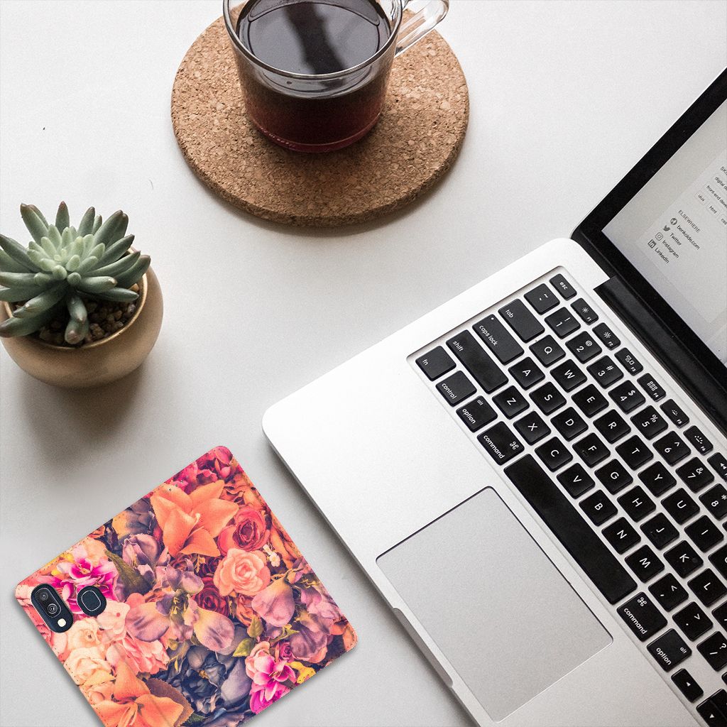 Dit Bosje Bloemen doet een mens en zijn smartphone goed. De oranje, paarse en roze bloemen op deze Samsung Galaxy A40 Smart Cover geven jouw smartphone een zeer sierlijke uitstraling. Je wordt er ook meteen vrolijker van als je aan het appen, mailen of aan het bellen bent. Valt dan je telefoon op de grond, dan zal er dankzij de stand case met oranje, paarse en roze bloemen geen schade ontstaan. Onze stand cases met oranje, paarse en roze bloemen bieden de allerbeste bescherming en zijn heel praktisch, wat blijkt uit onder meer het vakje aan de binnenkant en de handige standaard waarmee je de smartphone rechtop op tafel neer kunt zetten. De oranje, paarse en roze bloemen passen goed op alle zijden van de case. Op deze stand case van leer en TPU (houder aan de binnenkant) is het ook mogelijk je eigen ontwerp te zetten. In no time maak je zelf een stand case met daarop foto’s van jouw favoriete bloemen.