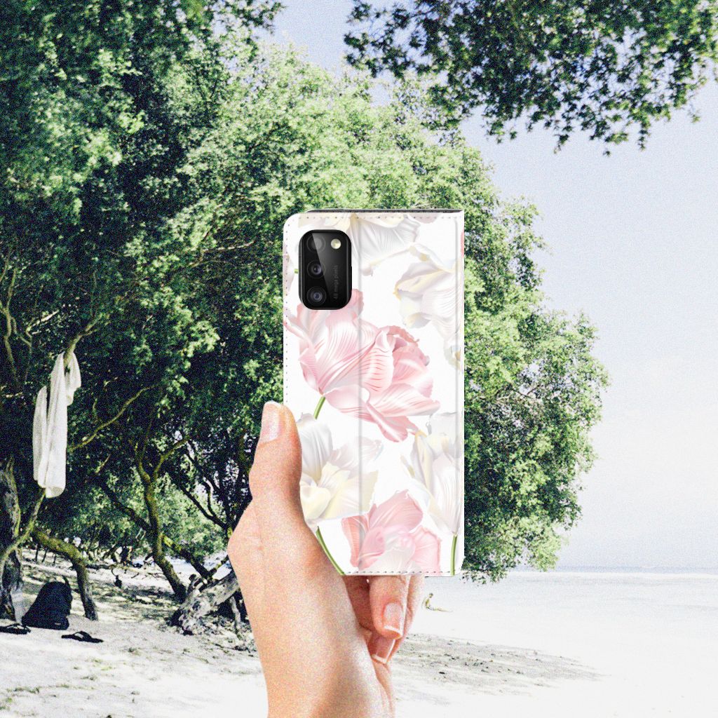 Een bosje bloemen doet een mens (en zijn smartphone) goed. De witte en roze bloemen op dit Samsung Galaxy A41 Smart Cover geven jouw smartphone een zeer mooie uitstraling. Je wordt er ook meteen een stuk rustiger van als je aan het appen of aan het bellen bent. Valt dan je telefoon op de grond, dan zal er dankzij de stand case met het design Lovely Flowers ontstaan. Onze stand cases met roze en witte bloemen zien er zeer prettig uit en zijn heel praktisch, wat blijkt uit onder meer het vakje aan de binnenkant en de handige standaard waarmee je de smartphone rechtop op tafel neer kunt zetten. De roze en witte bloemen passen goed op alle zijden van de case. Op deze stand case van leer en TPU (houder aan de binnenkant) kun je trouwens ook je eigen bloemige ontwerp zetten. In een paar simpele stappen maak je zelf een stand hoesje met daarop jouw mooiste bloemen.
