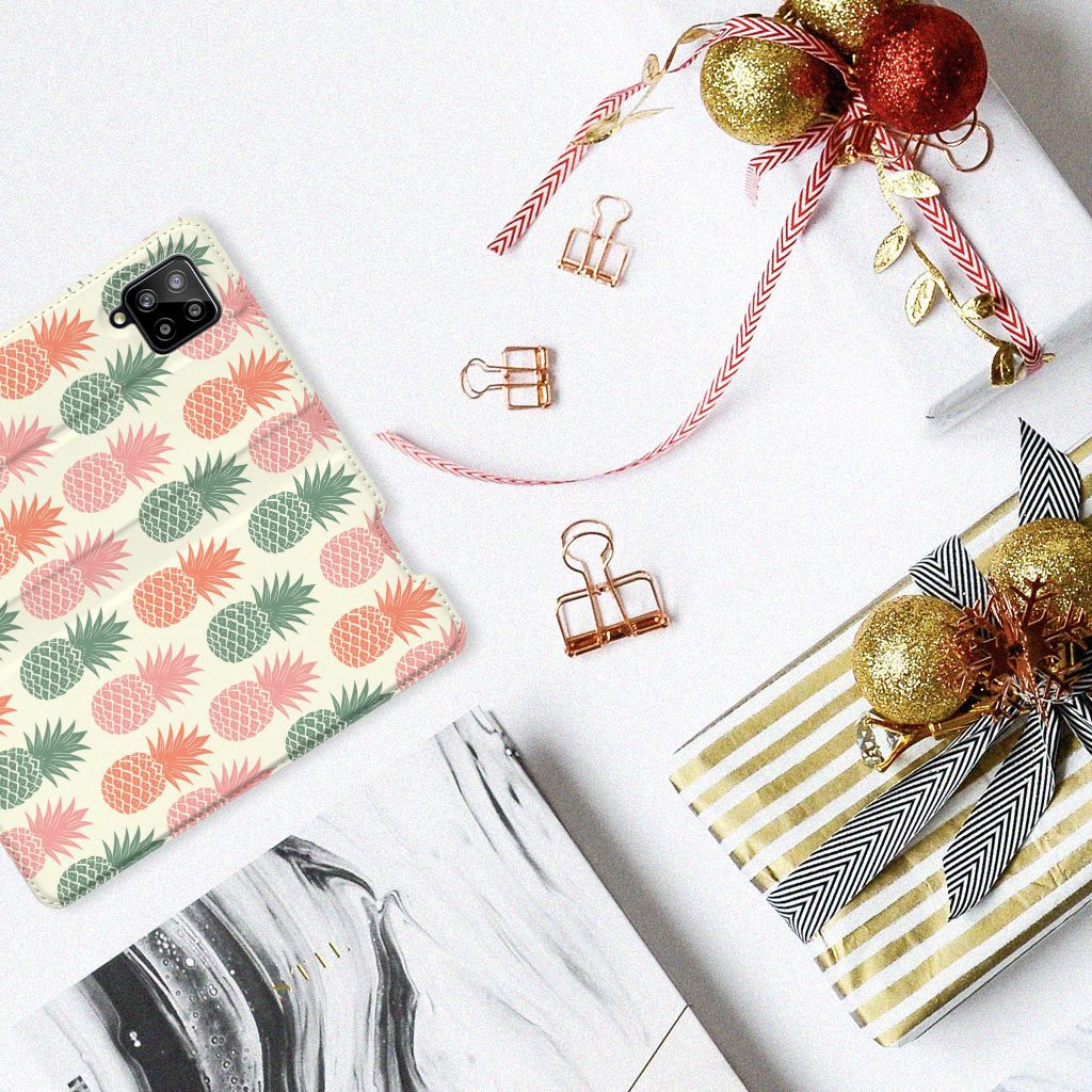 Ananas is een woord uit het Tupi, de taal van de Tupi-indianen, en betekent uitmuntende vrucht. Dit fruit van zeer hoge kwaliteit staat op onze superieure boekhoesjes, stand cases, hard cases en TPU cases. Jij blijft er gezond uitzien als je zo nu en dan een hap neemt van een Ananas , jouw smartphone blijft tip top in orde als je er een leuk telefoonhoesje omheen doet. Een ananas heeft stevig, veerkrachtig vruchtvlees. Een beetje te vergelijken met het TPU in onze hoesjes. TPU is elastisch materiaal, dat zeer buigzaam is. Vandaar dat het zeer schokbestendig is. Het ananas design staat op een stand case. Deze Samsung Galaxy A42 Flip Style Cover beschermt jouw telefoon aan alle kanten en beschikt over een 1 opbergvakje en een speciale standaard. Het hoesje wordt afgesloten met een magneet aan de binnenzijde. De houder aan de binnenzijde is van TPU.