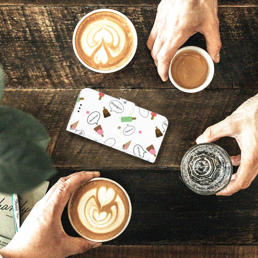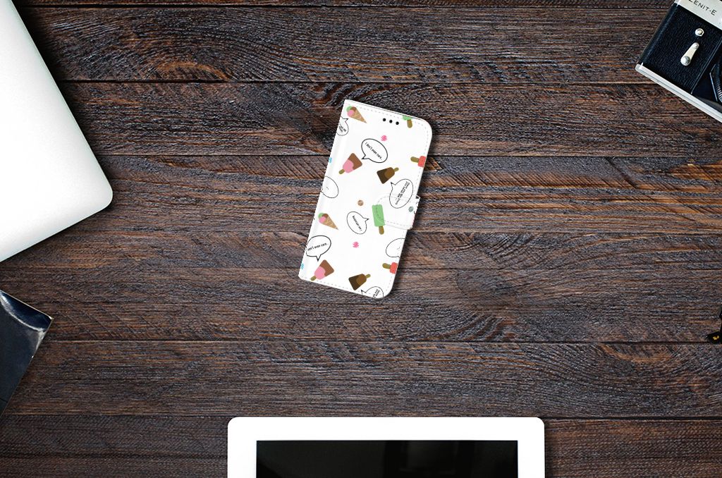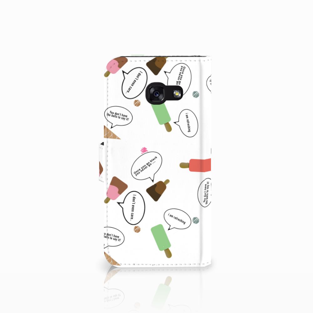 Van dit vrolijke Samsung Galaxy A5 2017 Book Cover met daarop verschillende soorten ijsjes met tekstwolkjes krijg je sowieso een vrij en zomers gevoel. De zomer komt naar je toe met deze print van ijsjes met tekstwolkjes. Ben je op het strand, dan ontbreekt een lekker ijsje natuurlijk niet. Net zoals je je smartphone bij de hand hebt, met daaromheen een design hoesje met bijzondere ijsjes en tekstwolkjes. Jouw telefoon kan dan de bescherming in de vorm van een boekhoesje met ijsjes zeer goed gebruiken. Alle zijden van dit hoesje worden bedrukt met ijsjes en tekstwolkjes. De case heeft een lipje aan de buitenzijde voor het afsluiten van de telefoon en de houder aan de binnenzijde is van TPU. Onder alle weersomstandigheden zal deze case met verschillende opbergvakjes perfect functioneren, ook op het strand met een ijsje in je hand.