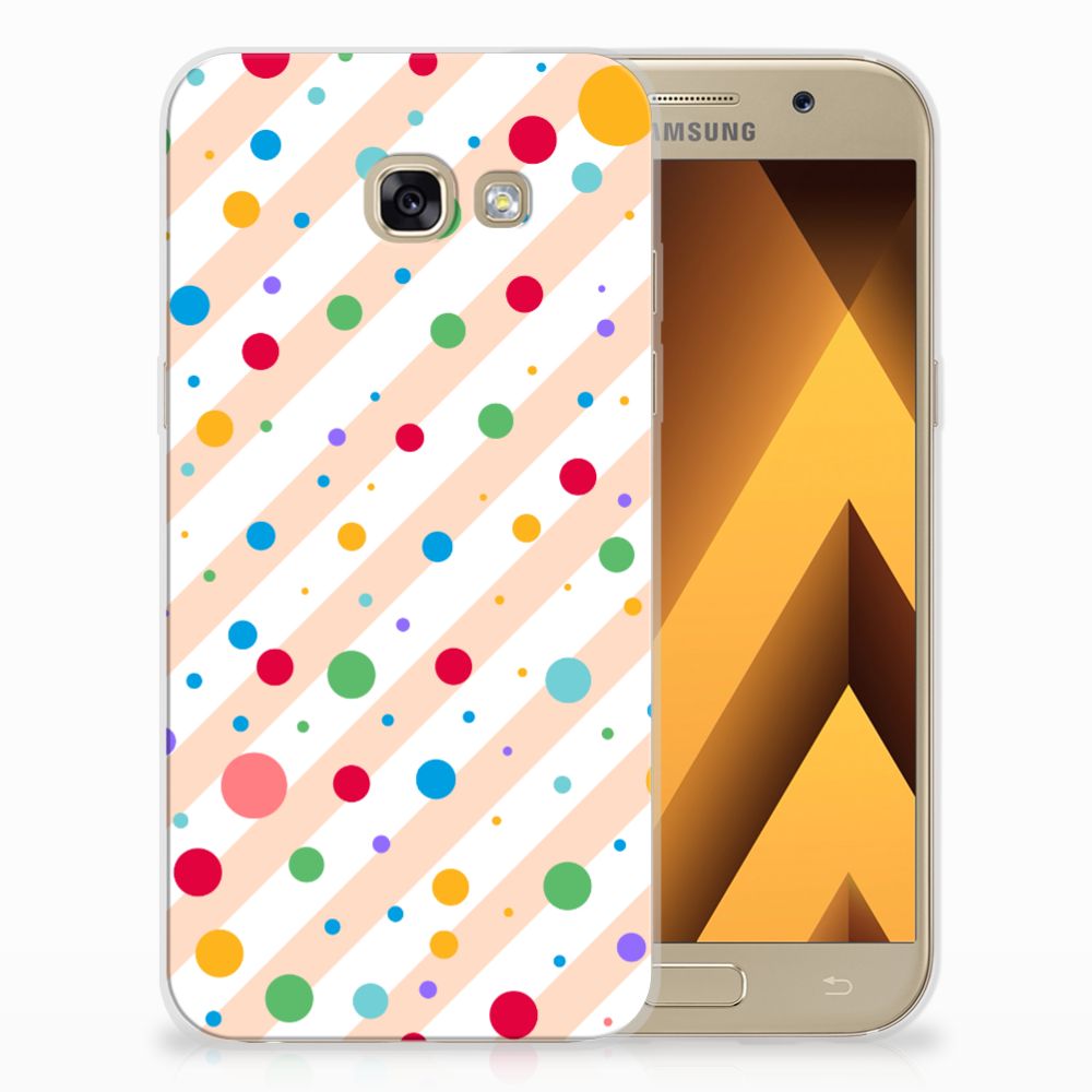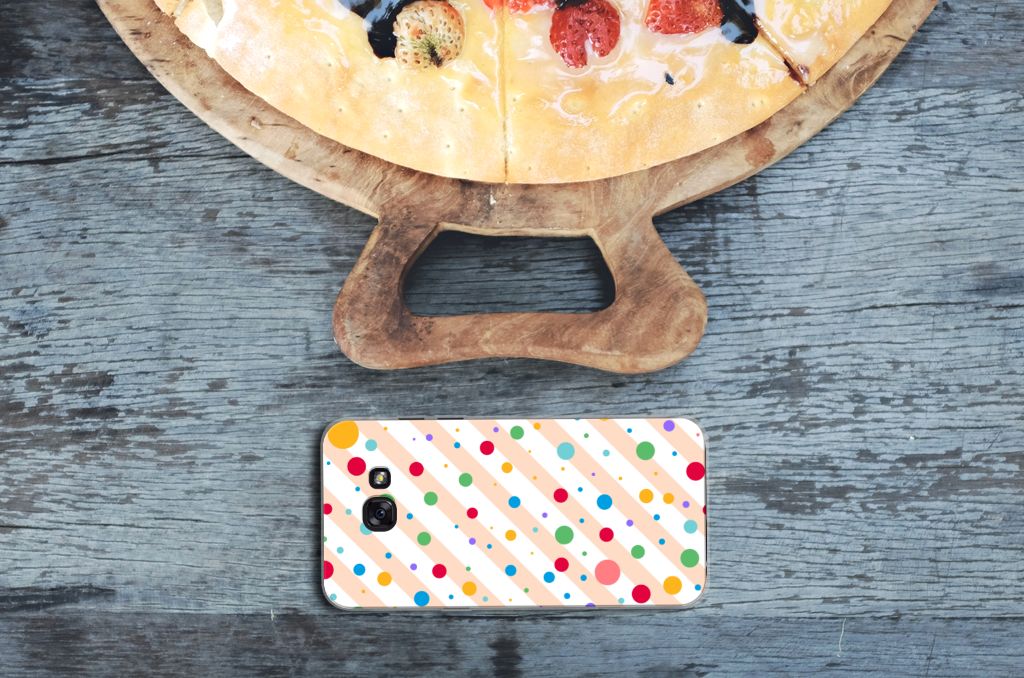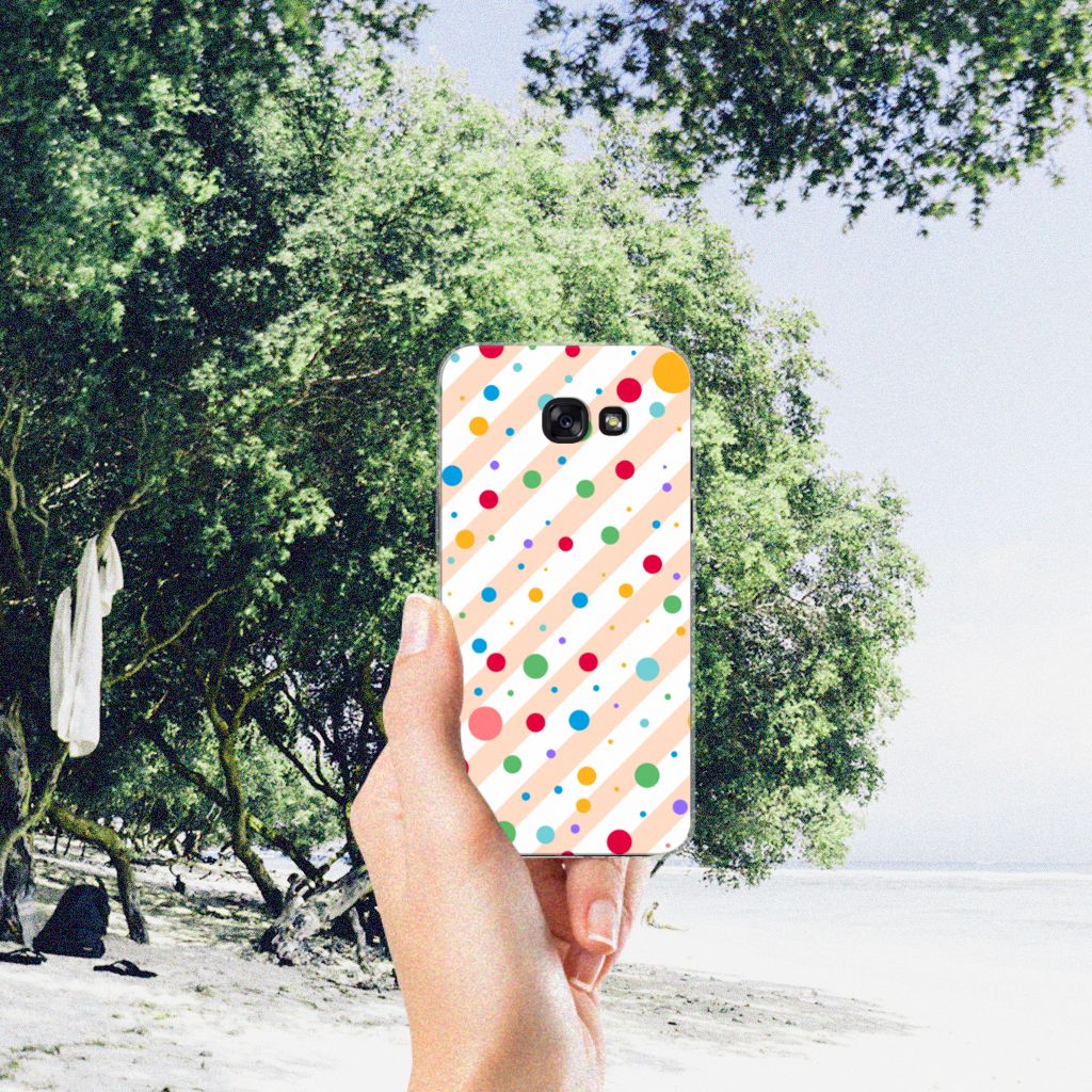 Een Samsung Galaxy A5 2017 TPU bumper met verschillende kleuren stippen is een schitterende bescherming van jouw smartphone. De tpu case met het design Dots in alle kleuren van de regenboog komt voor jou als geroepen. Maak je geen gebruik van dit zeer mooie hoesje, dan kan het met jouw smartphone een beetje beroerd aflopen. Deze mooie tpu case met verschillende soorten klompen in verschillende kleuren is zo’n beetje de meest flexibele case die er bestaat. Het hoesje met stippen zorgt voor een goede bescherming van je smartphone, vooral aan de achterzijde en zijkanten. Met een tpu hoesje met stippen in verschillende kleuren blijft jouw gsm volledig in tact. Heb je liever een tpu case met stippen in andere opvallende kleuren? Ontwerp dan zelf een tpu case met je eigen foto’s en teksten! De case wordt aan de achterzijde bedrukt met klompen, de zijkanten blijven doorzichtig.