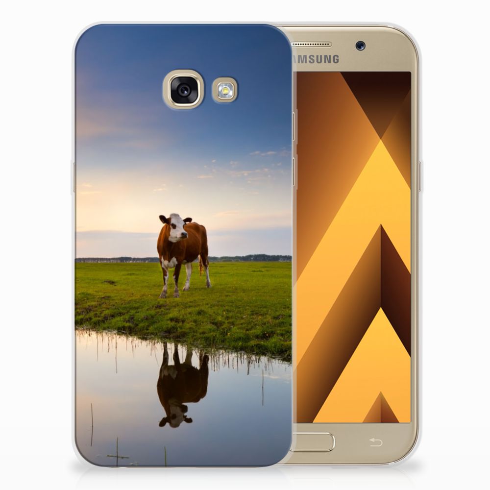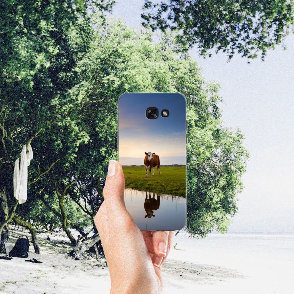 Het levert een idyllisch plaatje op, dit hoesje met een koe en ondergaande zon op de achtergrond. Door een koe buiten te laten lopen en grazen, hebben ze minder kans om ziek te worden. De Koe graast het liefst met soortgenoten, al zijn deze een stukje van de koe op de case verwijderd. Dit levert ook een mooi plaatje op, zoals je kunt zien op dit design hoesje. Dit tpu hoesje met koeien ziet er flexibel uit en is voorzien van alle uitsparingen. Een Samsung Galaxy A5 2017 TPU Hoesje met koeien beschermt jouw smartphone vooral aan de achterkant en zijkanten. De zijkanten blijven transparant, de rest van het hoesje is bedrukt. Koeien herkauwen het liefst liggend, behalve wanneer het regent. Zo goed als grazen voelt voor koeien, zo duurzaam zal jouw smartphone blijven met dit design hoesje. Het TPU is schokabsorberend en niet te breken. De TPU case past altijd in je broekzak.