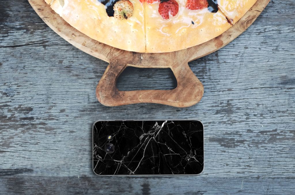 Dit design hoesje met Marmer Zwart is voor de artistieke personen onder ons. De Grieken en Romeinen wisten het materiaal al te waarderen door het in de bouw toe te passen. Naast het witte marmer met haar zacht grijze geaderde belijning zijn de diverse soorten in een gevarieerd kleurenpallet te krijgen. We hebben mooie kleuren op design hoesjes gezet, zoals in dit geval zwart marmer. Dit is een Samsung Galaxy A5 2017 TPU Siliconen Hoesje met marmer in bruine kleur. Het marmer wordt bedrukt op de voorkant van een tpu case, die beschikt over opstaande randen aan de voorkant en heel goed combineert met een screenprotector van glas of van folie. De rijkdom aan kleuren en varianties in afwerking geeft ontwerpers de vrijheid om met marmer hele mooie architectonische projecten te realiseren. Wij hebben onze designer tevens veel vrijheid gegeven. Het resultaat zie je terug in deze tpu case met zwart marmer, die jouw smartphone goed beschermt. De zijkanten van de case worden niet bedrukt met het zwarte marmer.