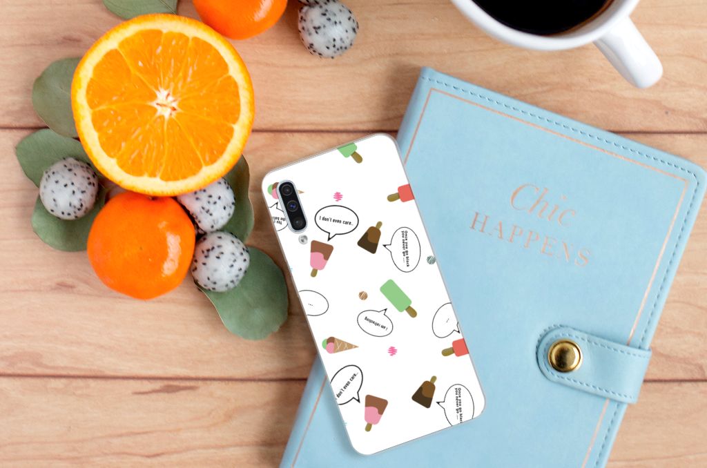 Van deze vrolijke Samsung Galaxy A50 Siliconen Case met daarop verschillende soorten ijsjes met tekstwolkjes krijg je sowieso een vrij en zomers gevoel. De zomer komt naar je toe met deze print van ijsjes met tekstwolkjes. Ben je op het strand, dan ontbreekt een lekker ijsje natuurlijk niet. Net zoals je je smartphone bij de hand hebt, met daaromheen een design hoesje met bijzondere ijsjes en tekstwolkjes. Jouw telefoon kan dan de bescherming in de vorm van een tpu hoesje met ijsjes zeer goed gebruiken. De bovenkant van dit hoesje wordt bedrukt met ijsjes en tekstwolkjes, de zijkanten blijven doorzichtig. De case is gemaakt van schokabsorberend materiaal en past altijd in je broekzak. Onder alle weersomstandigheden zal deze TPU case perfect functioneren, ook in de zomer met een ijsje in je hand.