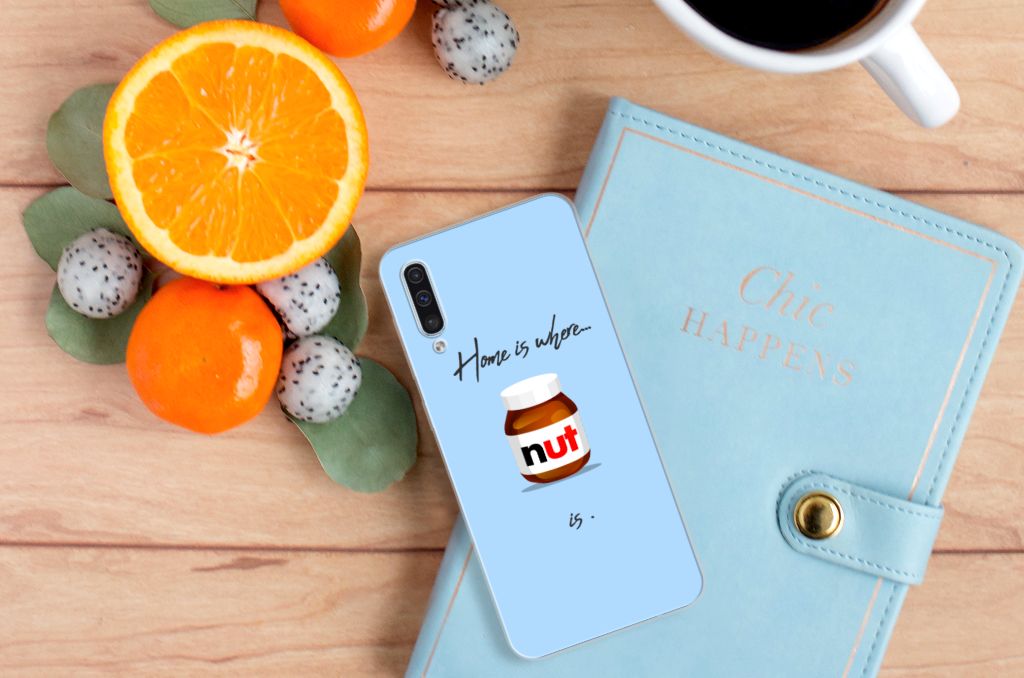 Ben je liefhebber van chocoladepasta, dan is dit het perfecte Samsung Galaxy A50 Siliconen Case voor jou. De chocoladepasta is enorm populair, dus is het niet zo heel gek dat je een ‘Nut Home’ tpu case in een blauwe kleur aantreft in ons assortiment design hoesjes met illustraties. Dit tpu hoesje is zeer flexibel en past altijd in je broekzak. Alleen de bovenkant van dit hoesje wordt door ons bedrukt in blauwe kleur met de pasta, op zeer duurzame manier. Mensen die houden van de bekendste pasta van het moment, kiezen voor deze blauwe tpu case. Er staan geen illustraties op de zijkanten van een tpu case. Je kunt ook een eigen tekst toevoegen aan het opvallende design.