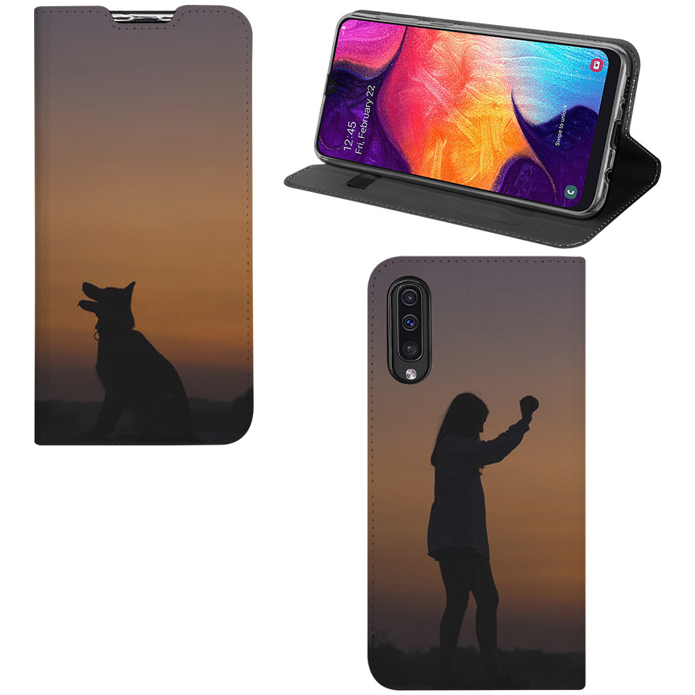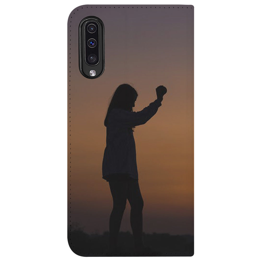 Samsung Galaxy A50 Standcase Hoesje Maken met Foto. Ben je op zoek naar originele en unieke bescherming voor je telefoon? Dan ben je bij B2C Telecom aan het juiste adres! Je kunt via onze website gemakkelijk een telefoonhoesje maken met foto's, tekst of bedrijfslogo. Wees zo creatief mogelijk en upload foto's of plaatjes van je kinderen, huisdieren, familie, hobby of favoriete voetbalclub. De foto's of plaatjes kun je vergroten, verkleinen of draaien voor een speels effect. Maak het hoesje persoonlijker door je naam of quote aan toe te voegen. Je kunt ook de keuze maken uit verschillende lettertypes van strak tot dik gedrukt of liever iets sierlijks? Het kan allemaal! De kers op de taart is natuurlijk de toevoeging van een glossy-effect! Kies uit verschillende effecten en jouw hoesje wordt subtiel bedrukt met een glossy-effect. Kortom verschillende mogelijkheden om een hoesje zo persoonlijk en uniek mogelijk te maken! Ben je ook benieuwd naar de functionaliteiten van het hoesje? Lees dan verder! Jouw ontwerp wordt bedrukt op een wit hoesje gemaakt van kunstleer. De binnenkant van het hoesje is donkergrijs van kleur en heeft één vakje voor een pasje. De houder waarin je je telefoon vast zet is gemaakt van transparante TPU. Het hoesje wordt door magneten aan de binnenkant stevig dicht gehouden. Ook fijn is dat het hoesje een stand-case functie heeft voor als je graag filmpjes kijkt op je telefoon. Overtuigd? Ontwerp dan je eigen telefoonhoesje en ontvang het binnen een aantal werkdagen in huis!