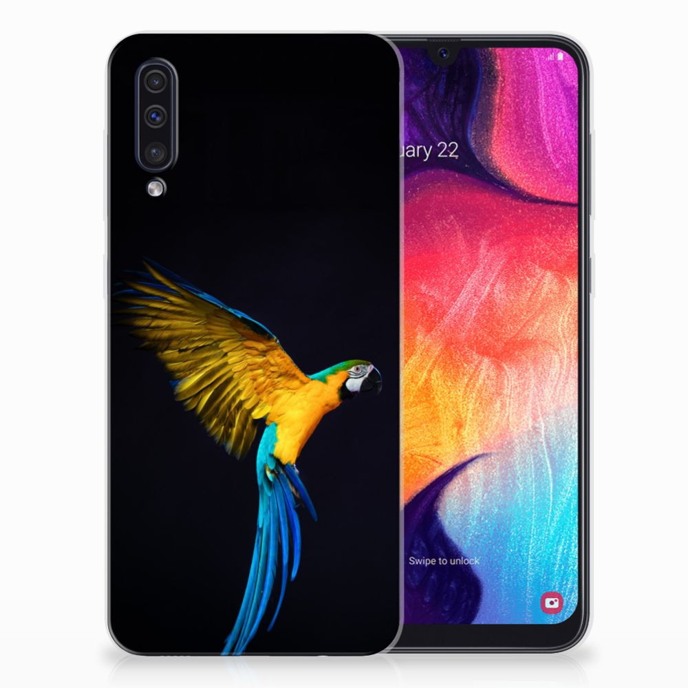 Dit design hoesje met Papegaai tegen een zwarte achtergrond is een zeer flexibele bescherming voor jouw smartphone. Dit komt vooral omdat deze print op een tpu case staat. Dit is een zeer buigzaam hoesje, dat de telefoon vooral aan de achterkant en zijkanten beschermt. De bovenkant van de Samsung Galaxy A50 TPU Hoesje wordt bedrukt met deze schitterende print. De zijkanten blijven doorzichtig. Papegaaien zijn erg sociale vogels die voldoende aandacht en gezelschap nodig hebben. Als je er voor kiest om een papegaai aan te schaffen, is het een goed idee om een koppeltje te nemen. Koop je meerdere tpu cases met een papegaai, dan ga je automatisch minder betalen per hoesje. Wij hanteren een systeem van bundelkorting. Dus koop dit hoesje met opstaande randen voor een spotprijs.