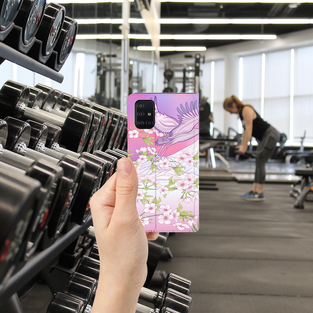 Met deze opvallende en kleurrijke Samsung Galaxy A51 Hoesje maken met Bird Flying design blijft jouw toestel in uitzonderlijke staat. Een ooievaar fleurt al sinds mensenheugenis dorpen en steden op en doet dit ook met jouw stand case. Het design hoesje met deze reigerachtige vogel in roze en paarse kleuren is een zeer goede bescherming voor je telefoon. Het spetterende stand hoesje met opvallende ooievaar beschermt jouw telefoon aan alle zijden en beschikt over een opbergvakje voor een pasje of briefgeld. De roze met paarse case sluit perfect af met de magneet aan de binnenzijde. De houder aan de binnenzijde van het schitterende stand hoesje is van TPU. Dit is ook nog eens zeer flexibel materiaal. Het pu leer aan de buitenkant oogt zeer chique. Kijk voor andere dieren op een design hoesje binnen deze fraaie collectie. Ook kun je zelf een hoesje ontwerpen met je favoriete huisdier.