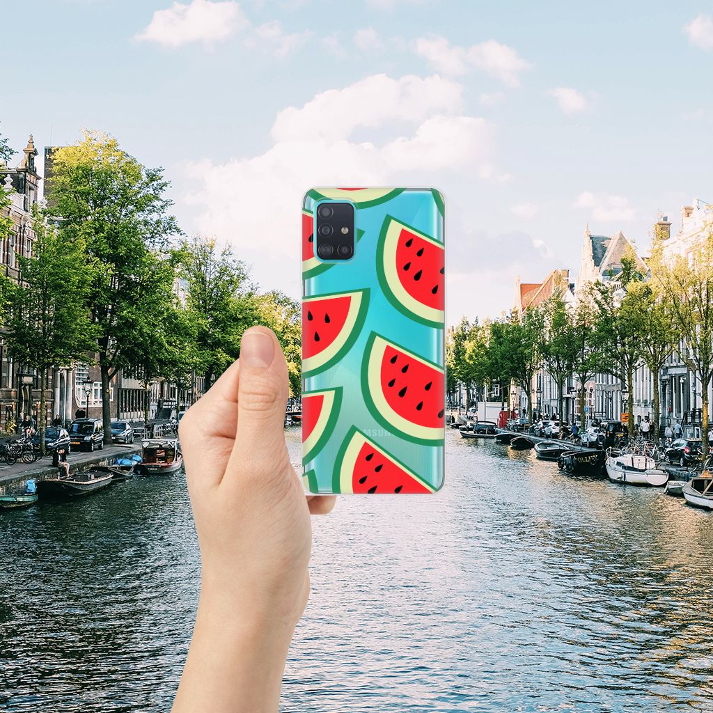Watermeloenen zijn uitstekende dorstlessers, misschien dat je daarom juist in de zomermaanden extra enthousiast raakt van dit design hoesje Watermelons. Jij blijft gezond als je zo nu en dan een watermeloen neemt, jouw smartphone blijft in tact als je er deze Samsung Galaxy A51 Siliconen Case omheen doet. Deze tpu case wordt alleen aan de bovenkant bedrukt met watermeloenen is zeer flexibel. De randen van het hoesje blijven transparant. Je kunt ook kiezen voor andere soorten fruit op je hoesje. Kijk maar eens naar onze andere design hoesjes op onze website.