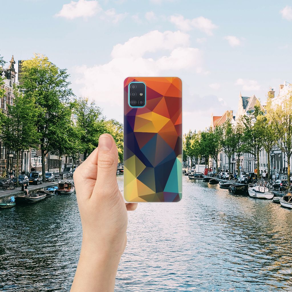 Veelkleurige driehoeken die samen eindeloze asymmetrische patronen lijken te vormen. Het is het abstracte schouwspel dat op dit fraaie hoesje voor je Samsung Galaxy A51 direct de aandacht trekt noemen we voor het gemak trekt noemen we voor het gemak Polygon Color. De een ziet er een berglandschap in, de ander piramides. Wat zie jij erin? Zeker is in elk geval dat de aanblik van dit fascinerende ontwerp je niet snel gaat vervelen. Het kleurige spel van lijnen en vlakken blijft eindeloos boeien en geeft jouw TPU Hoesje een hippe en kunstzinnige uitstraling. De kracht die het lijnenspel uitstraalt, komt ook terug in het hoesje zelf. Dit hoesje wordt alleen aan de bovenkant bedrukt en is zeer flexibel. De randen van het hoesje blijven transparant. Wat wil je nog meer?