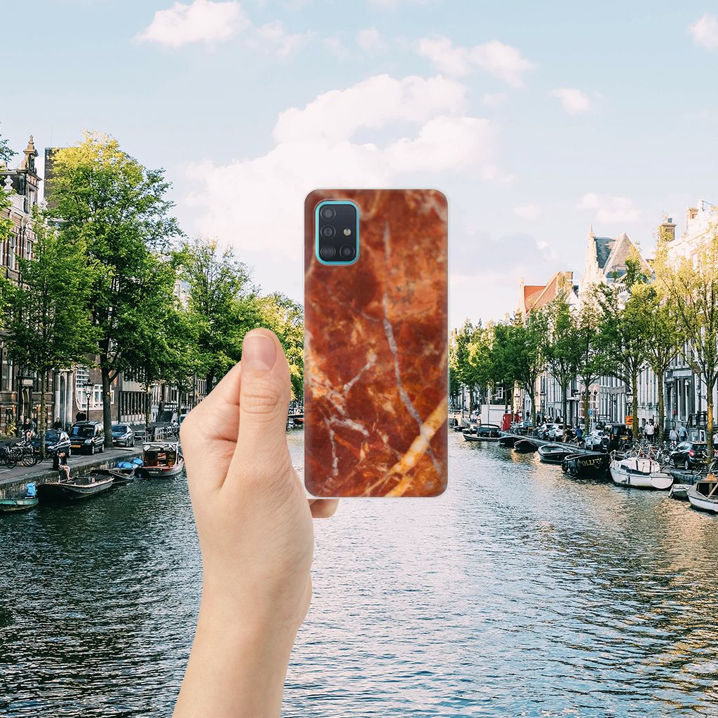 Dit design hoesje met Marmer Bruin is voor de artistieke personen onder ons. De Grieken en Romeinen wisten het al te waarderen door het als bouw- en bekledingsmateriaal toe te passen. Naast het witte Carrara marmer met haar zacht grijze geaderde belijning zijn de diverse soorten in een ruim kleurenpallet te krijgen. We hebben verschillende kleuren op design hoesjes gezet, zoals in dit geval bruin marmer. Dit is een Samsung Galaxy A51 TPU Siliconen Hoesje met marmer in bruine kleur. Het marmer wordt bedrukt op de voorkant van een tpu case, die beschikt over opstaande randen aan de voorkant en heel goed combineert met een screenprotector. De rijkheid aan kleuren en varianties in afwerking geeft ontwerpers de vrijheid om met marmer hele mooie architectonische projecten te realiseren. Wij hebben onze designer ook veel vrijheid gegeven. Het resultaat zie je terug in deze tpu case met bruin marmer, die jouw smartphone goed beschermt. De zijkanten van de case worden niet bedrukt met marmer.