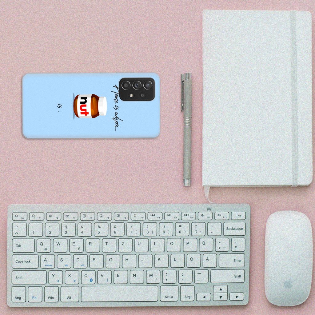 Ben je liefhebber van chocoladepasta, dan is dit het perfecte Samsung Galaxy A52 (5G/4G) Siliconen Case voor jou. De chocoladepasta is enorm populair, dus is het niet zo heel gek dat je een ‘Nut Home’ tpu case in een blauwe kleur aantreft in ons assortiment design hoesjes met illustraties. Dit tpu hoesje is zeer flexibel en past altijd in je broekzak. Alleen de bovenkant van dit hoesje wordt door ons bedrukt in blauwe kleur met de pasta, op zeer duurzame manier. Mensen die houden van de bekendste pasta van het moment, kiezen voor deze blauwe tpu case. Er staan geen illustraties op de zijkanten van een tpu case. Je kunt ook een eigen tekst toevoegen aan het opvallende design.