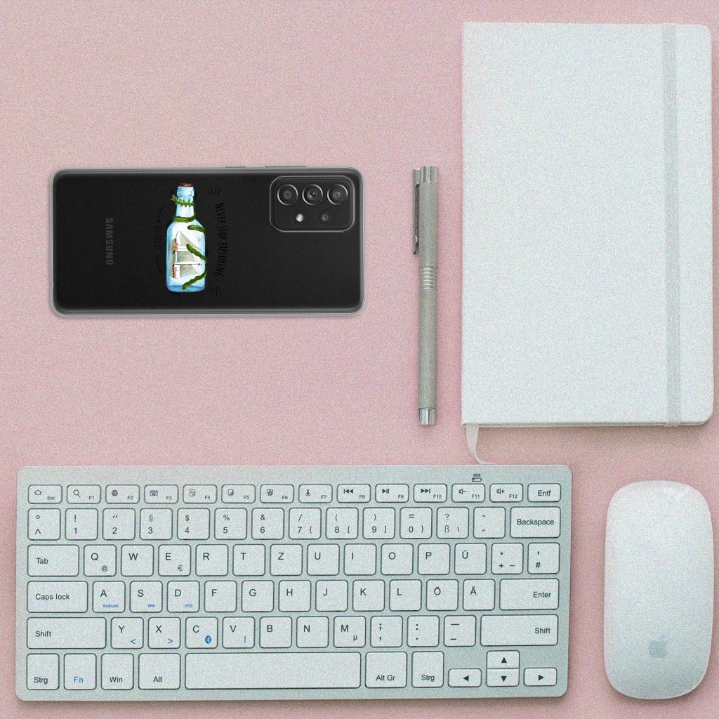 Dit leuke design met een schip in een fles is voor de echte avonturier of reiziger. Dankzij de tekst ‘Never stop exploring: Go for it’ word je altijd herinnerd aan het feit dat het volgende avontuur weer op de loer ligt! Dit design staat op een Telefoonhoesje met Naam voor je Samsung Galaxy A52 (5G/4G). TPU is flexibel en heel erg sterk. Zo is je telefoon aan de achterkant en de randen heel goed beschermd. De case is aan de bovenkant bedrukt, de randen blijven transparant. Het TPU-hoesje is perfect te combineren met een screenprotector, zo zijn je telefoon en je beeldscherm altijd goed beschermd.
